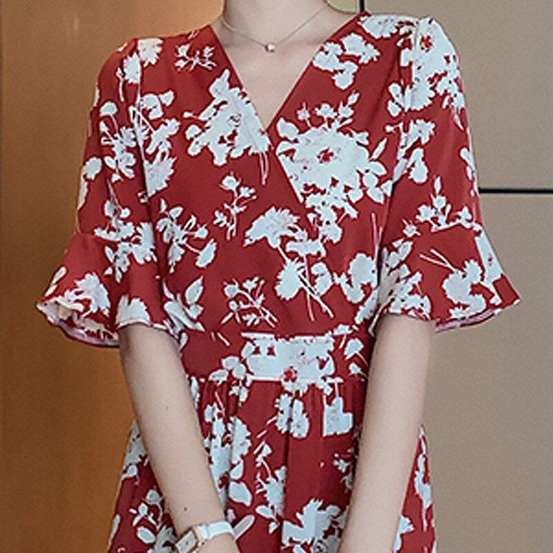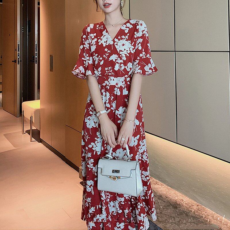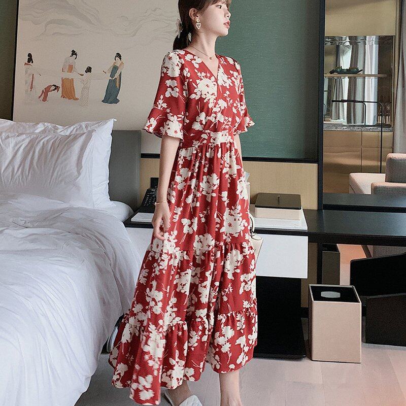 INWPLLR Japanese Style Women Dress Fashion Flower Printed Dress Korean Elegant Long Red Dress 2021 Summer Casual A-line Dresses Female