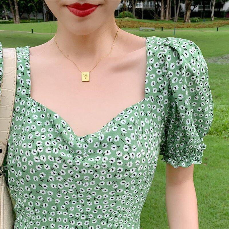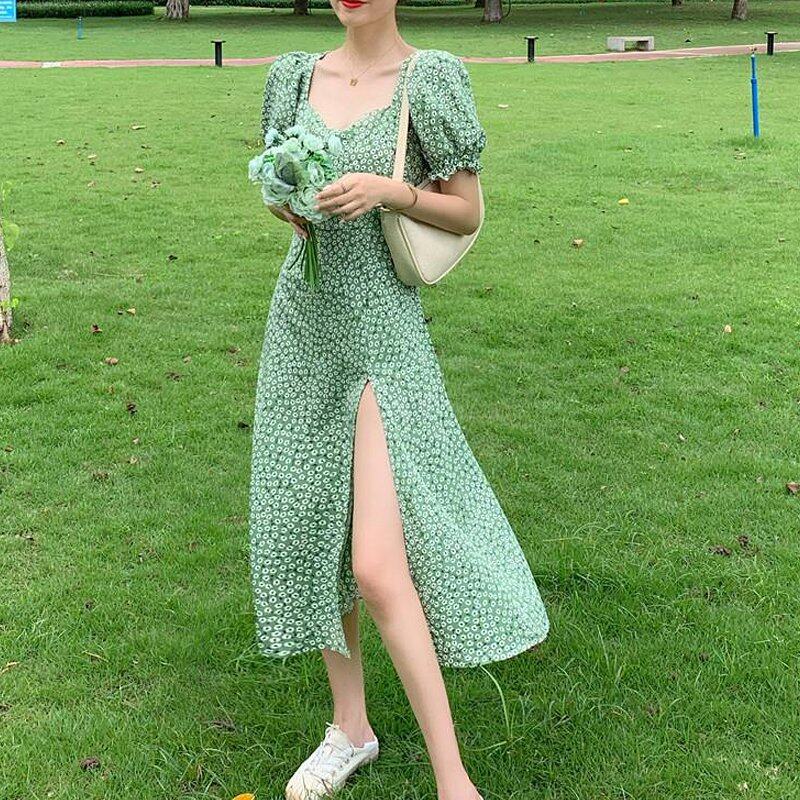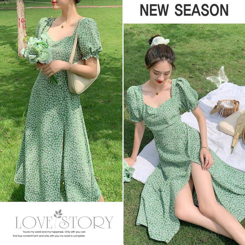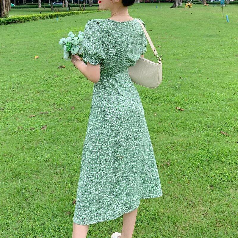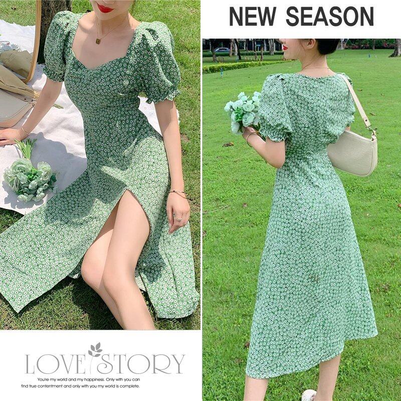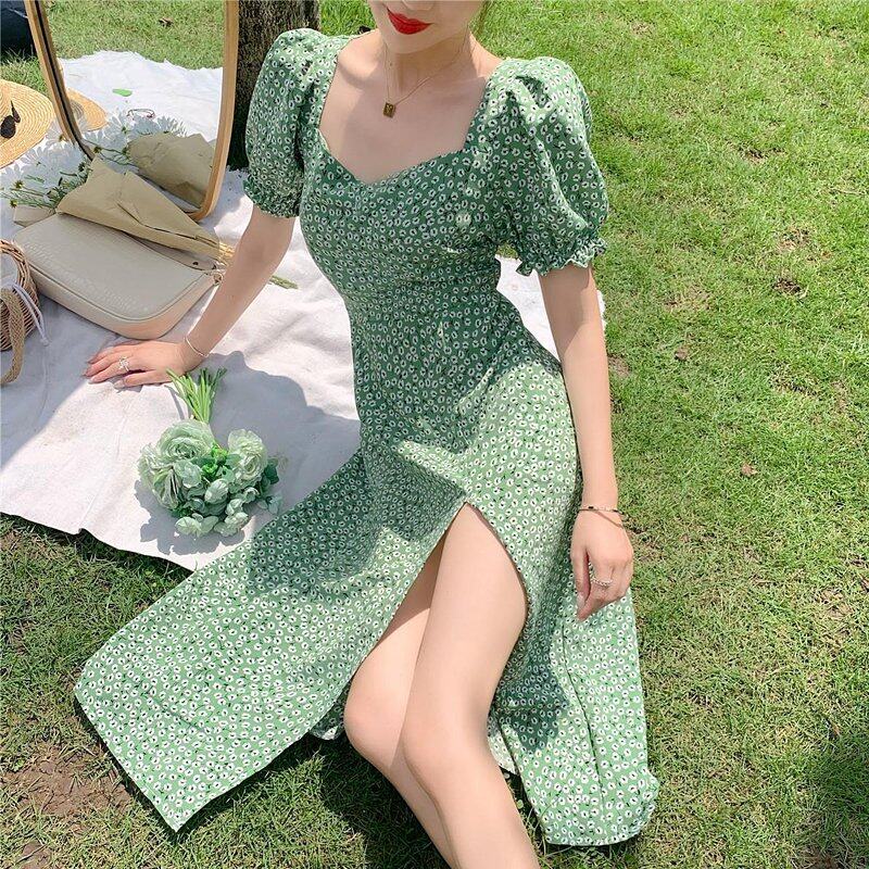 INWPLLR New Arrival Women Dress Green Floral Dress Fashion Casual Bubble Sleeve Dresses Summer Korean Version Square Collar Split Dress