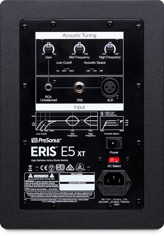Set up your studio monitors for your room.Acoustic tuning controls allow you to configure the Eris E5 XT perfectly for your room—you get Low-cut, Mid, and High controls, as well as 3-way acoustic space tuning that allows you to easily compensate for the sonic consequences of speaker placement against a wall or in a corner.