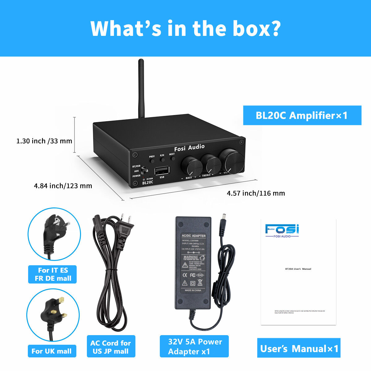 Fosi Audio BL20C With 32V Power Supply Bluetooth 5.0 2.1 HiFi Audio Receiver Amplifier Mini Class D Amp U-Disk Player 160W x2