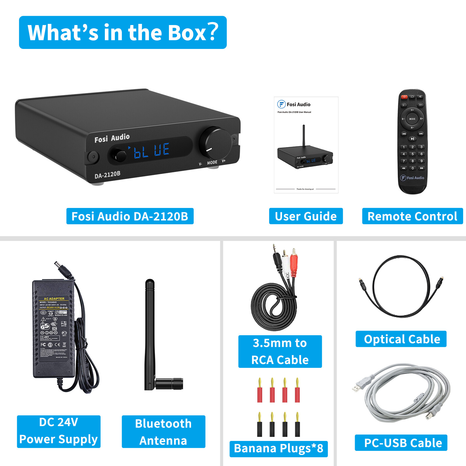 Fosi Audio DA2120B Bluetooth Amplifier Stereo Audio Wireless Amp Hifi Class D Power Amp 100W x2 Passive Speakers Remote Control With 24V Power Supply