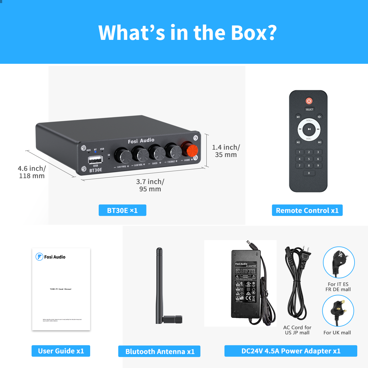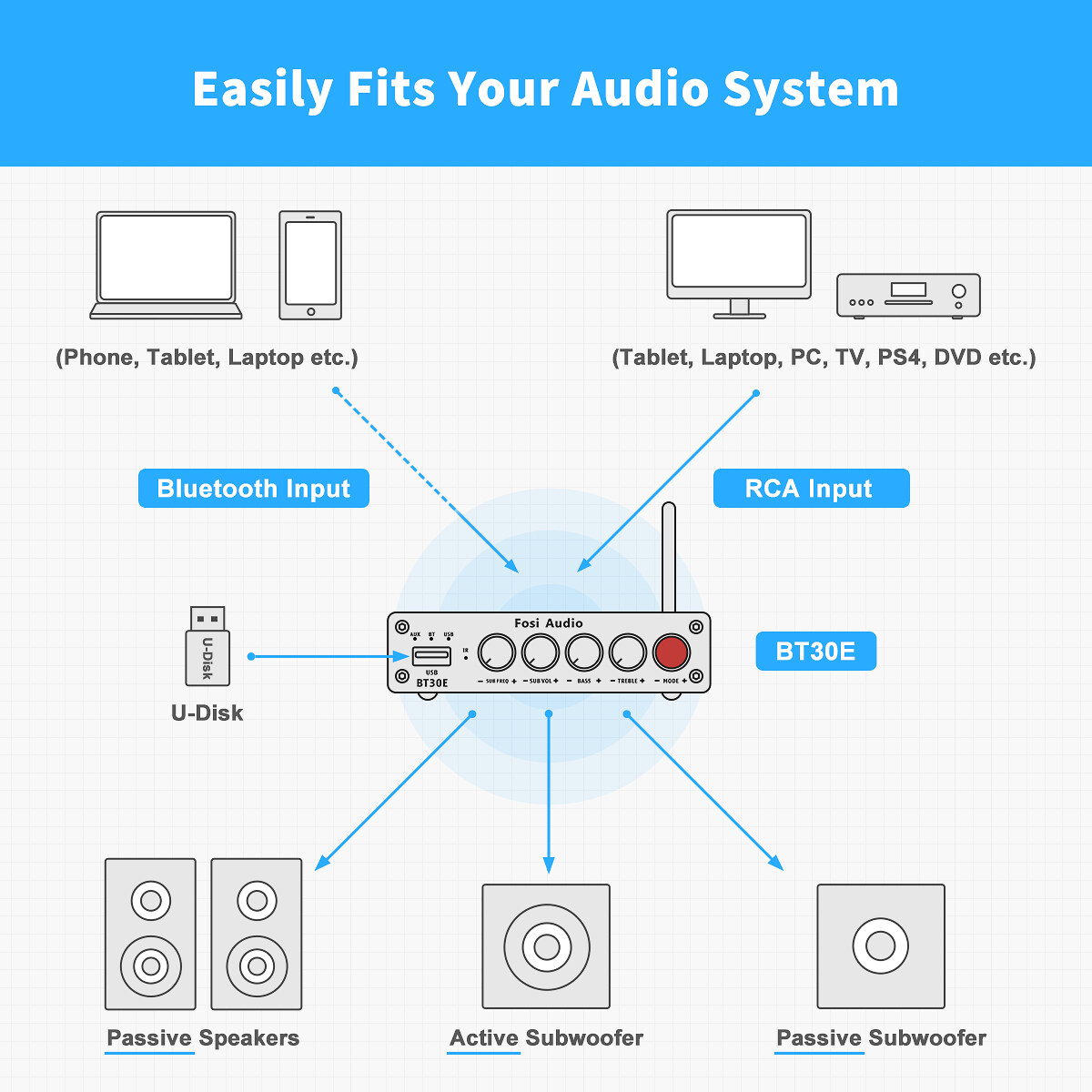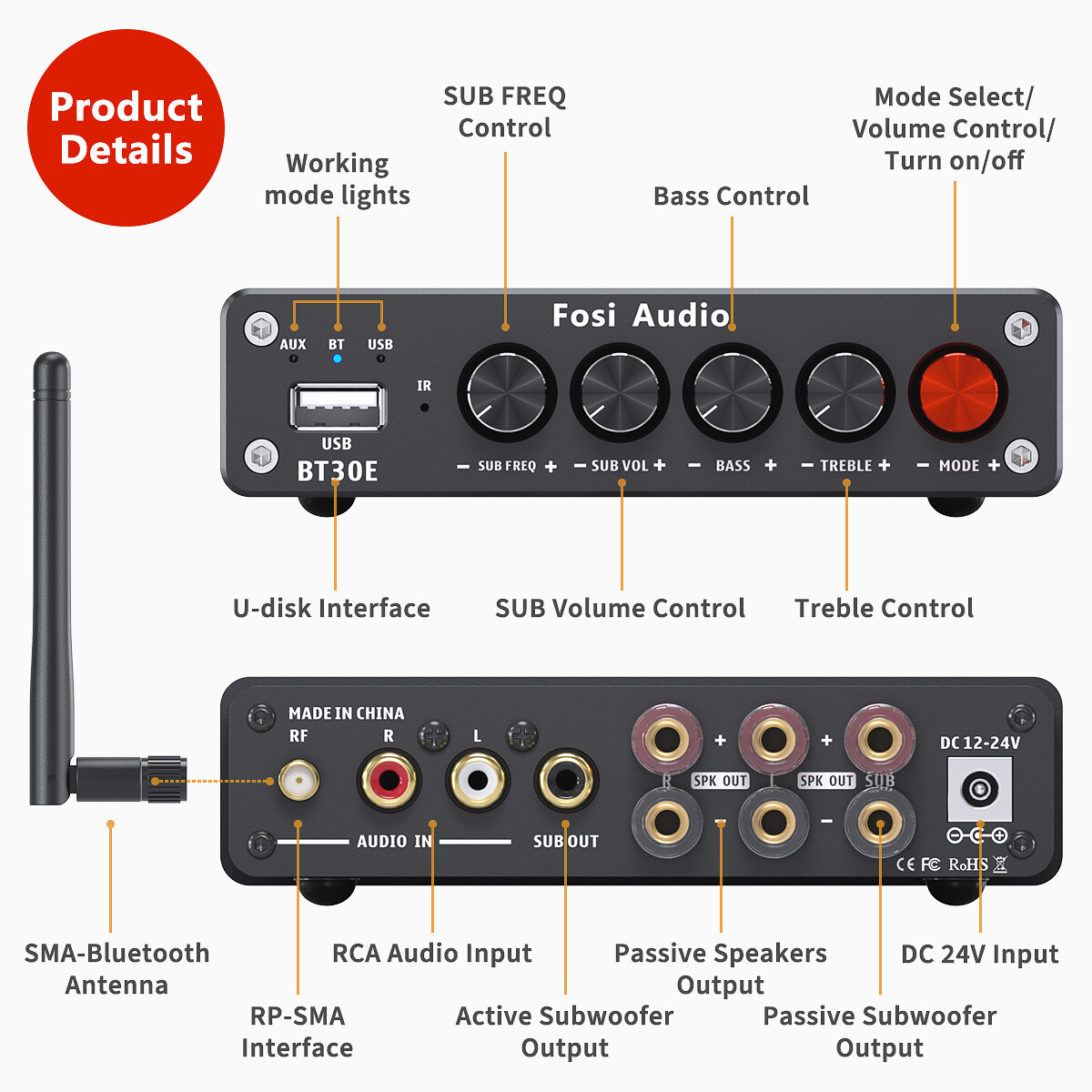 Fosi Audio Bluetooth 5.0 Sound Power Amplifier 2.1 Channel Integrated Amp & U-Disk Player Home Audio Subwoofer 100W BT30E With 24V Power Supply