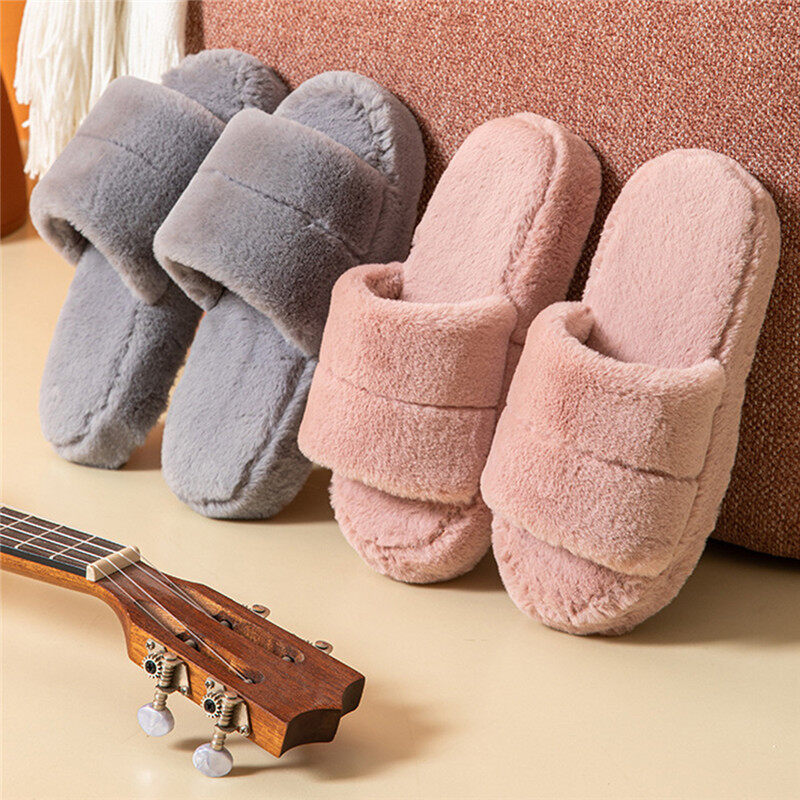 Home Slippers Solid Color Winter Plush Warm Flat Home Shoes Soft Shoes Open Toe Indoor Slippers