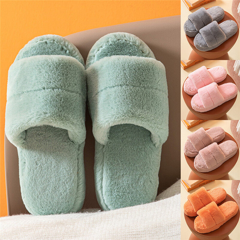 Features:Home Slippers Solid Color Winter Plush Warm Flat Home Shoes Soft Shoes Open Toe Indoor Slippers