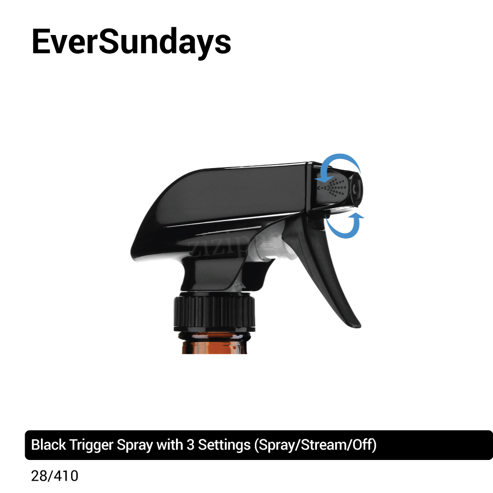 Each glass bottle comes paired with a black trigger spray. Our trigger sprays has 3 settings; wide fine spray, stream and off function.