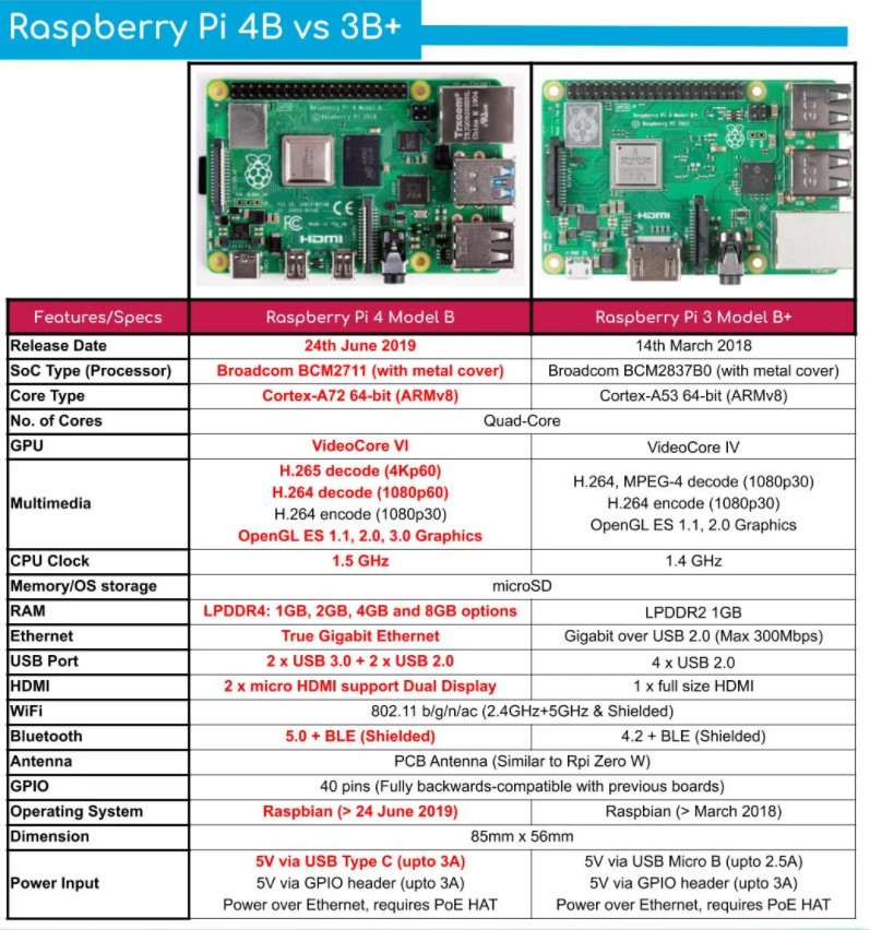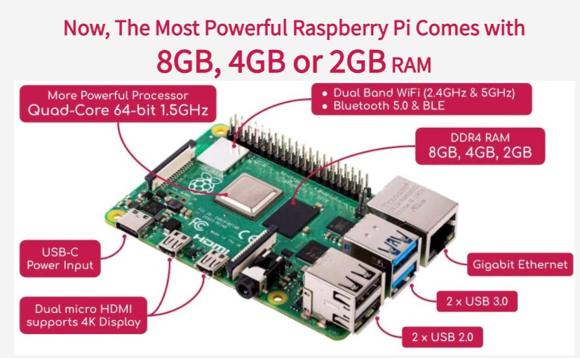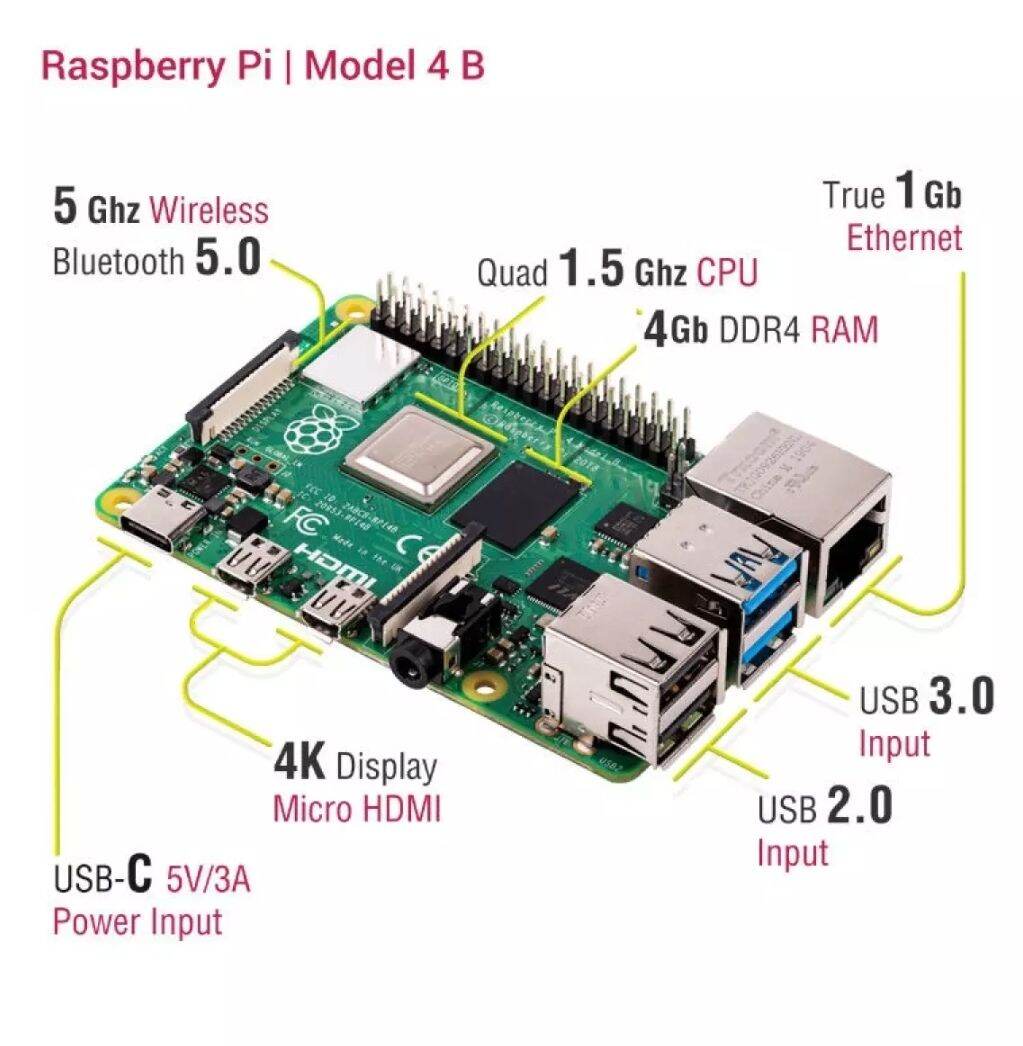What is Raspberry Pi 4Raspberry Pi 4 is your new desktop computer. The speed and performance of the new Raspberry Pi 4 is a step up from earlier models. Whether you're editing documents, browsing the web with a bunch of tabs open, juggling spreadsheets or drafting a presentation, you'll find the experience smooth and very recognisable — but on a smaller, more energy-efficient and much more cost-effective machineRaspberry Pi 4B requires latest Raspbian or NOOBS to boot up, get the 16GB microSD card preloaded with NOOBS here.FeaturesBroadcom BCM2711, 64-bit ARM Cortex-A73 (ARMv8), Quad-core, 28nm Processor SoC running @ 1.5GHz, with metal body for better heat dissipation.LPDDR4 4GB SDRAM / 8GB 2 x USB3.0 Port + 2 x USB2.0 PortExpanded 40-pin GPIO HeaderVideo/Audio Out: 4-pole 3.5mm connector2 x micro HDMI port, support 4K video, dual displayRaw LCD (DSI)Image/Camera input: CSI portStorage: microSDTrue Gigabit Ethernet, >900 MbpsPower-over-Ethernet (PoE) support (requires separate PoE HAT)2.4GHz and 5GHz IEEE 802.11.b/g/n/ac wireless LAN, Bluetooth 5.0 and BLE (Bluetooth Low Energy)Low-Level Peripherals: - 27 x GPIO - UART - I2C bus - SPI bus with two chip selects +3.3V +5V - GroundPower Requirement, 5V/3.0A via USB type C connector.Supports Raspbian, and check 3rd party Operating System here.Dimensions: 85mm x 56mm x 17mmPackage does not include charger or memory card. Raspberry Pi 4 Model B - 4GB / 8GB - rpi 4 b + 4 GB / 8 GB