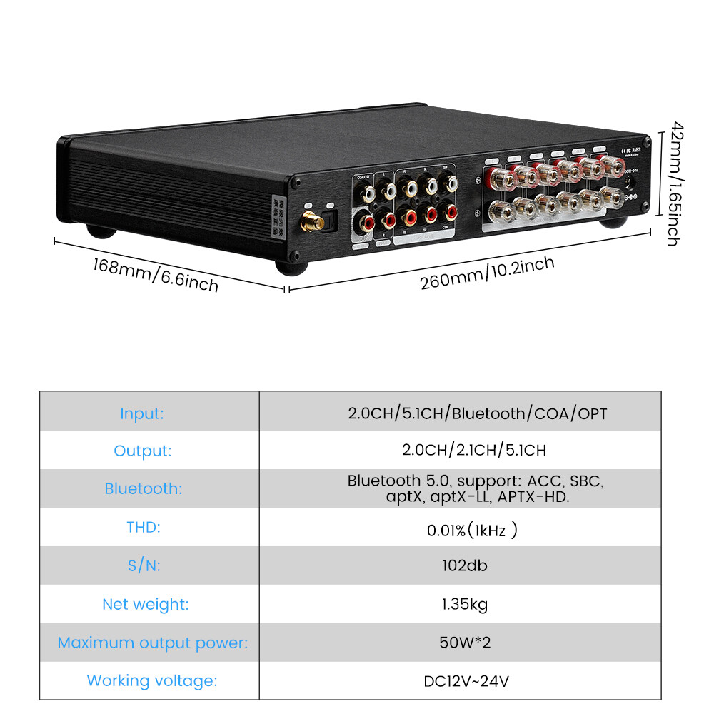 5.1 channel amp with professtional DSP decoding: A9 with built-in DSP decoding chip which applies professional algorithms and dynamic separation techniques, it auto allocates and simulates 2.1 and 5.1 channel and provide excellent smart noise reduction, precise sound positioning and stereo surrounded sense even though playing audio files of 2.0 channel.