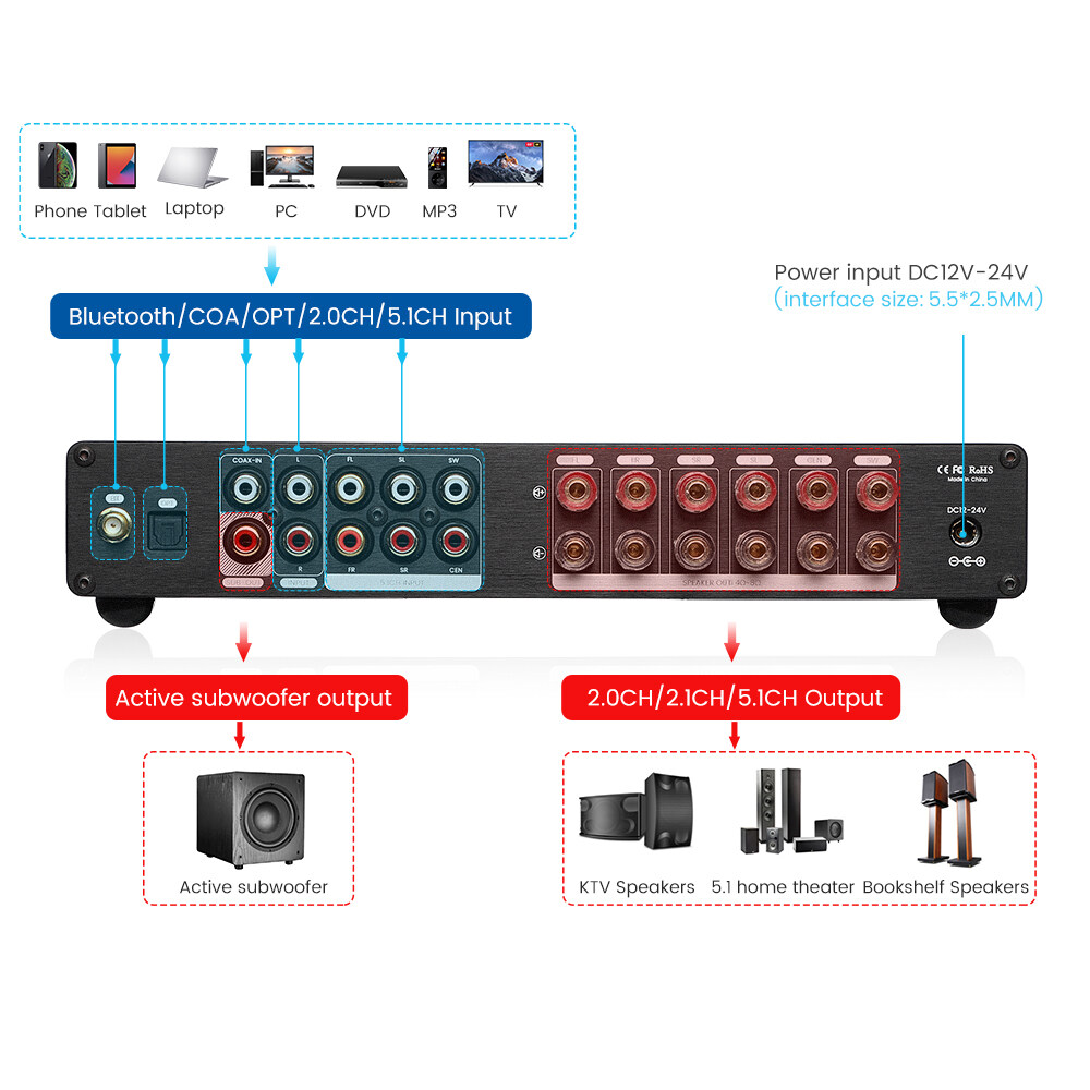 Audio input: Bluetooth/Coaxial /Optical/ 2.0 Channel RCA / 5.1 Channel RCA