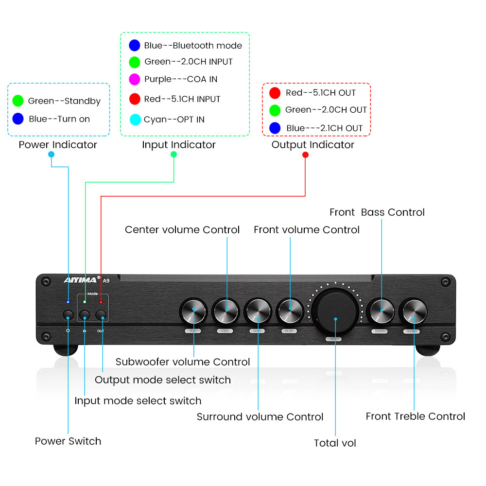Switchable 2.0/2.1/5.1 channel outputs,A9 can be used in different scenarios with one selection button, no need to plug in and out cables repeatedly.