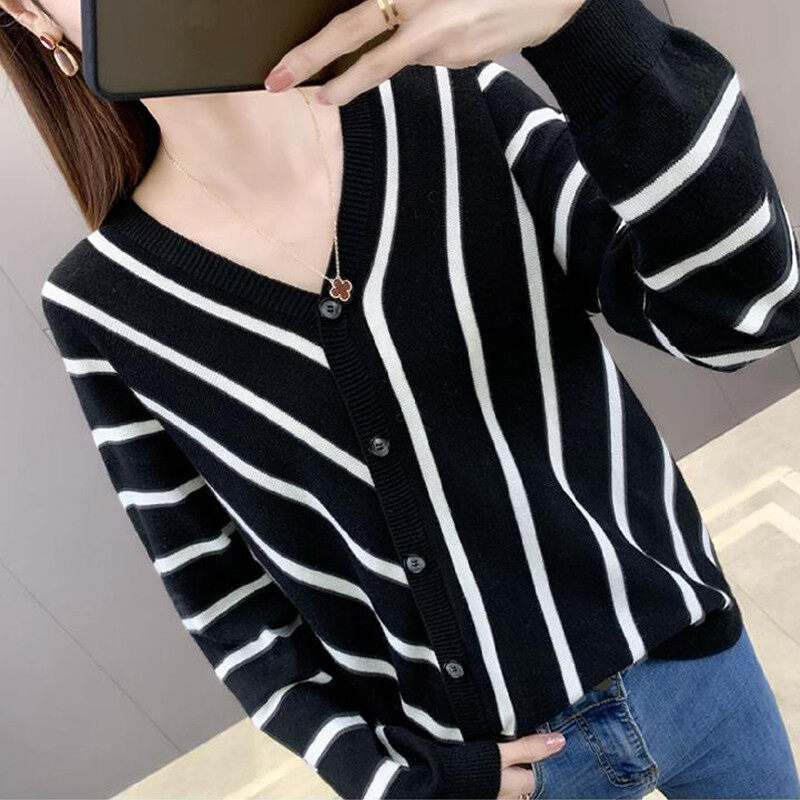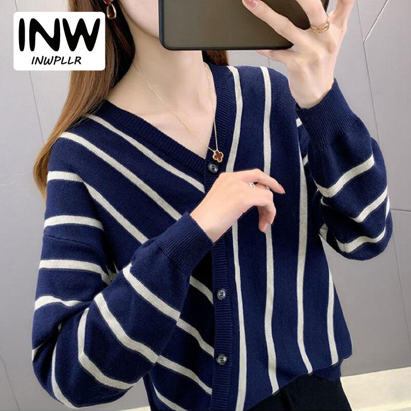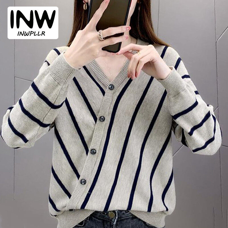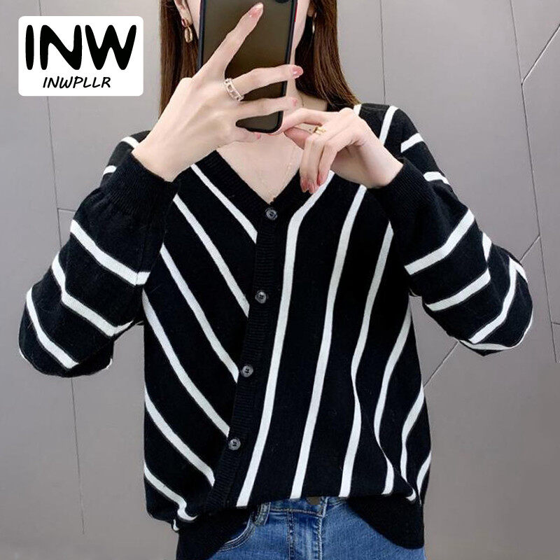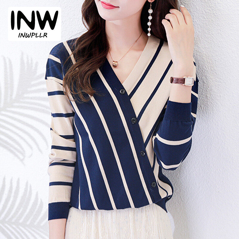 • INWPLLR Multi Colors Lady T-shirts Stripe Patchwork Tshirts Korean Buttons Knit Tops Autumn Fashion V-Neck Women Tops Tees