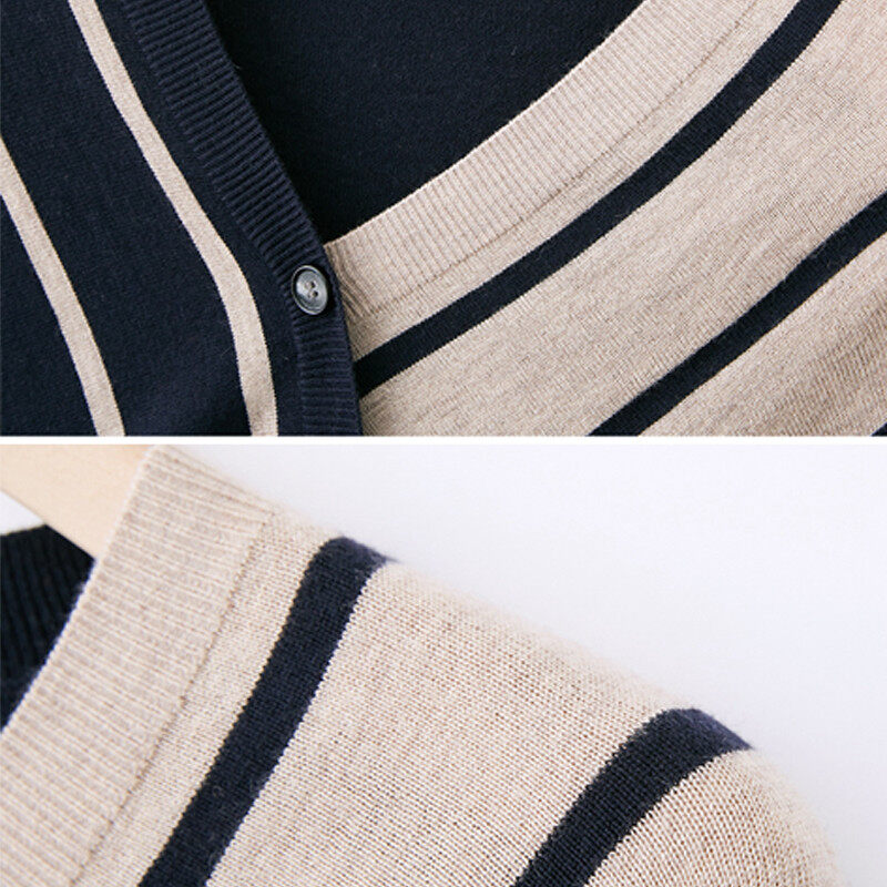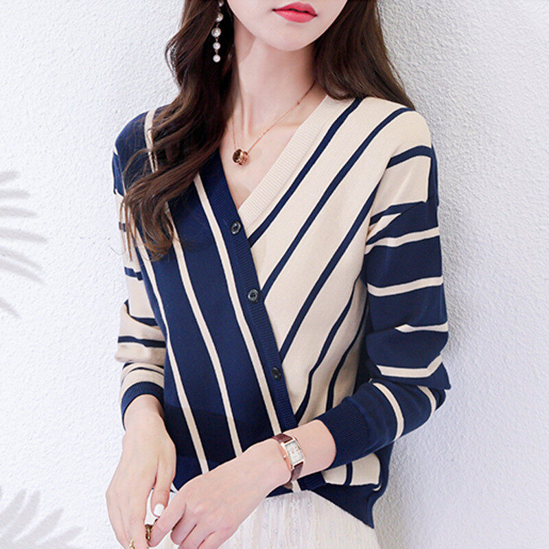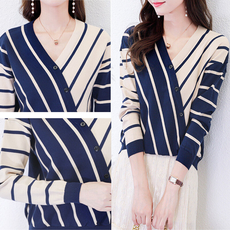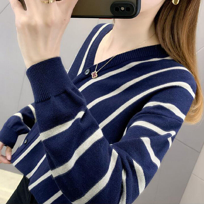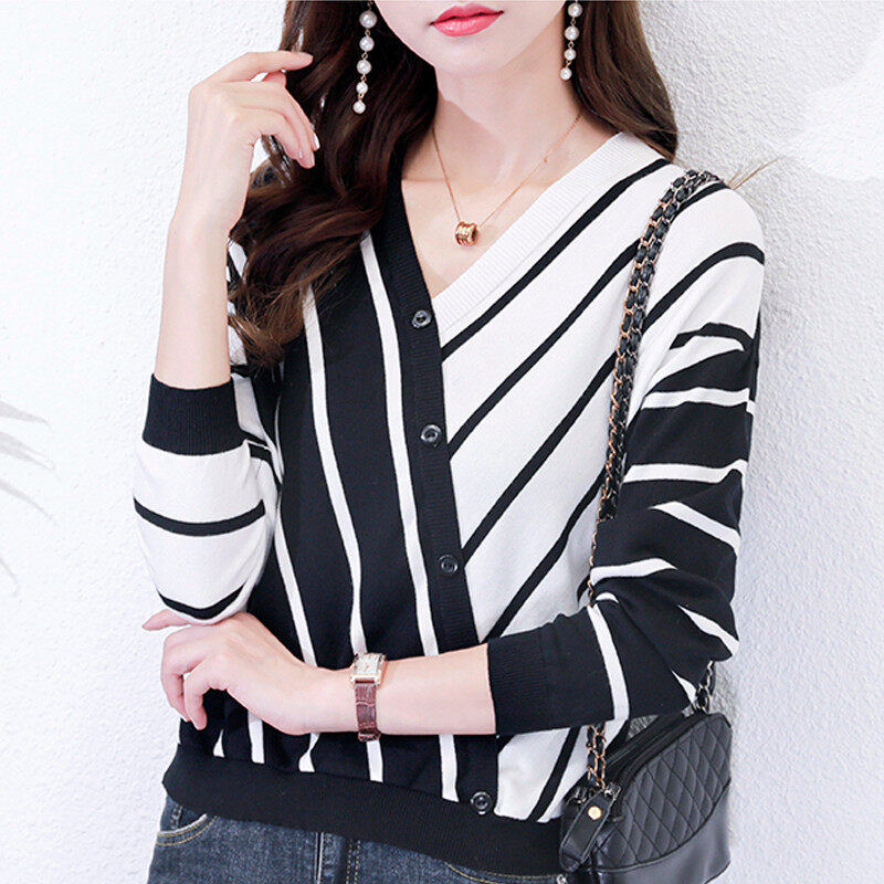 • INWPLLR Multi Colors Lady T-shirts Stripe Patchwork Tshirts Korean Buttons Knit Tops Autumn Fashion V-Neck Women Tops Tees