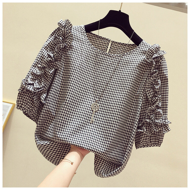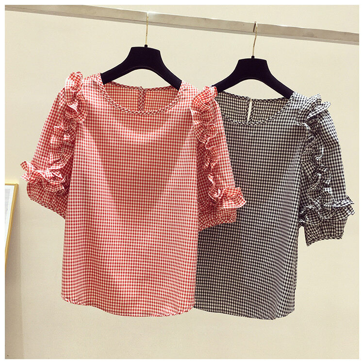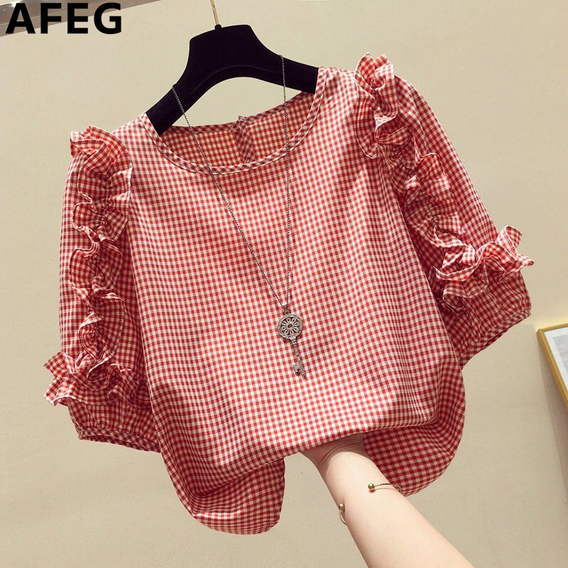 AFEG new Korean round neck fashion loose wild plaid chiffon short-sleeved blouse for women