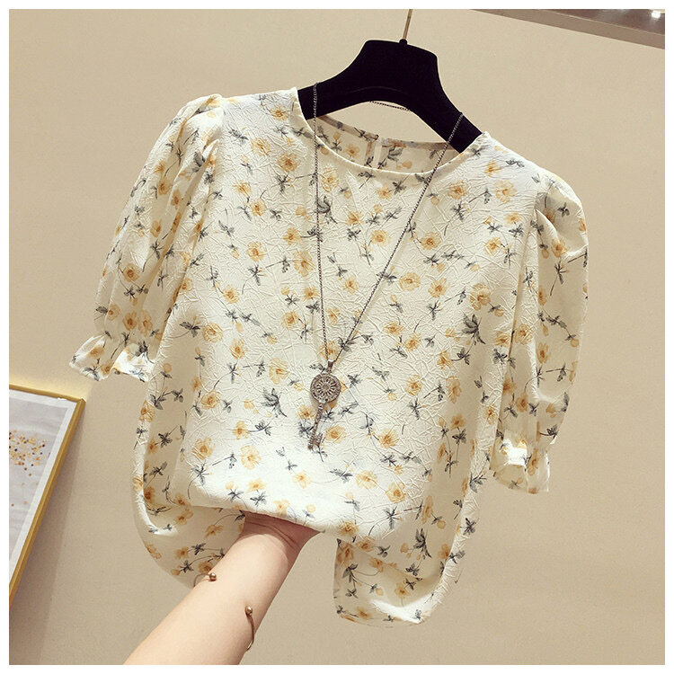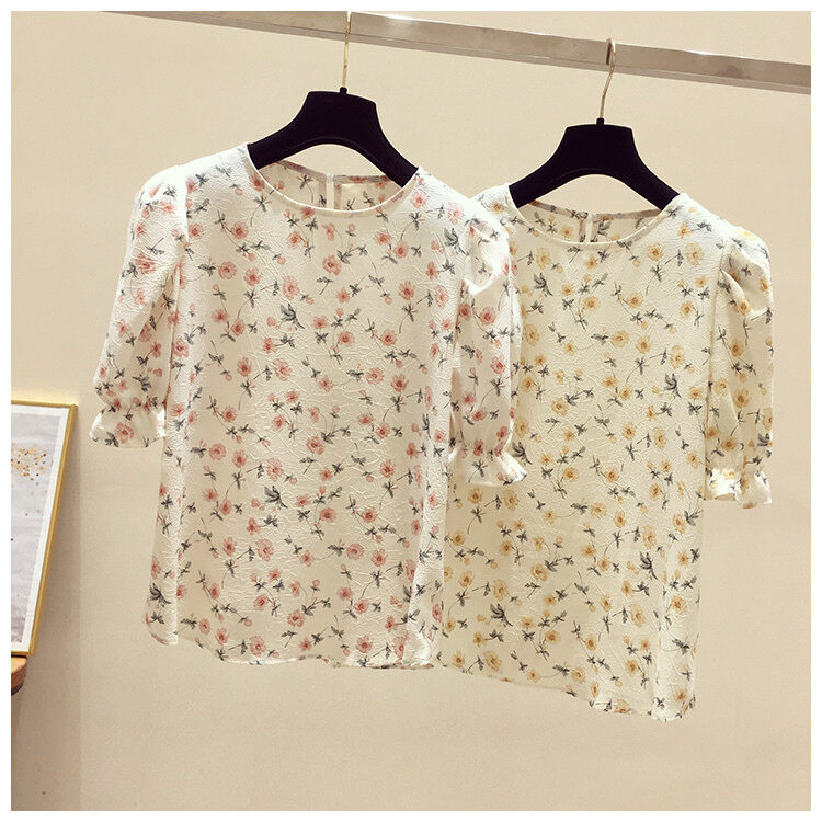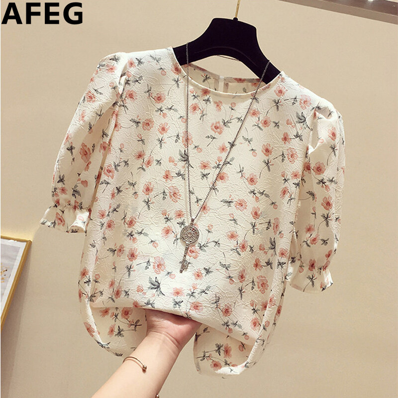 AFEG Korean round neck fashion loose wild floral chiffon short sleeve blouse for women