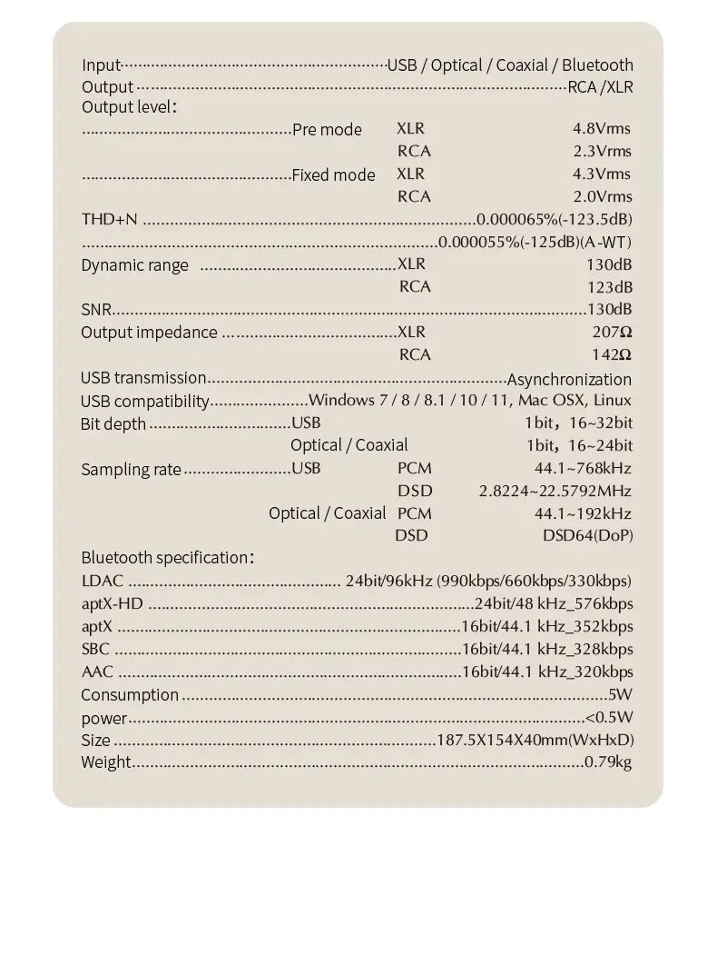 - XMOS XU-208, true 32bit audio processing, supports DoP and Native DSD, 32bit/768kHz DSD512