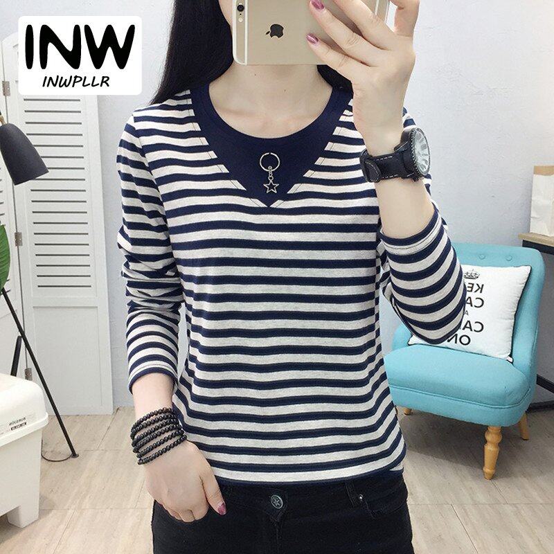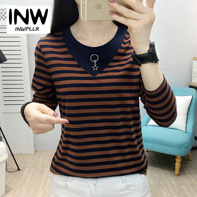 INWPLLR Autumn Women T-shirts Striped Patchwork T-Shirts Korean Long Sleeve Large Size Tops Female Casual O-Neck Tshirts For Women