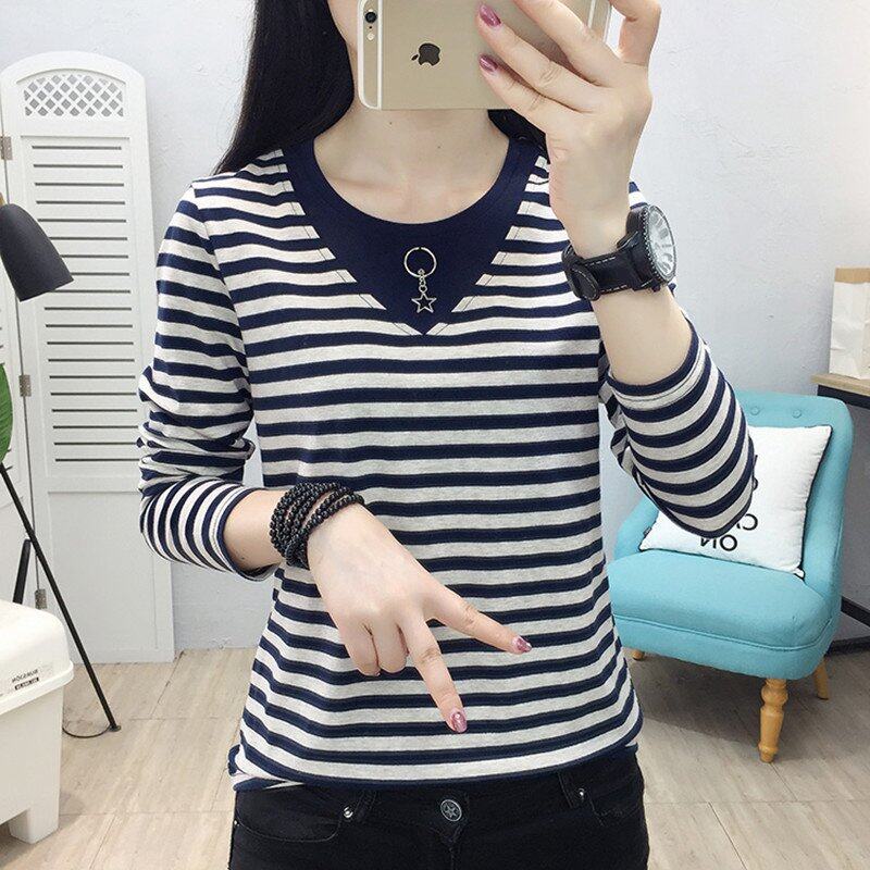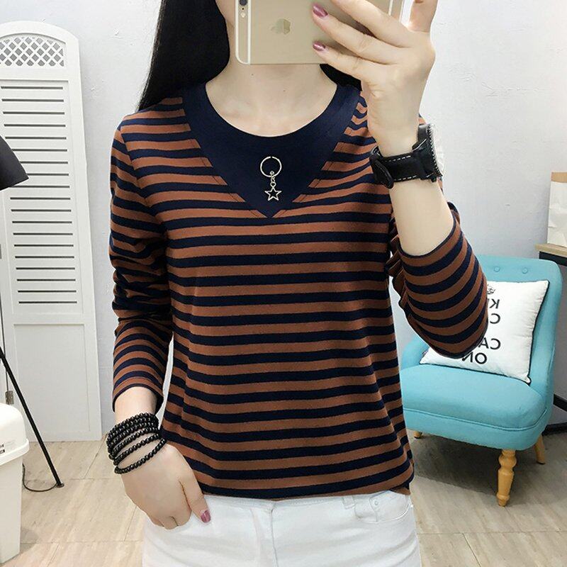 • INWPLLR Autumn Women T-shirts Striped Patchwork T-Shirts Korean Long Sleeve Large Size Tops Female Casual O-Neck Tshirts For Women