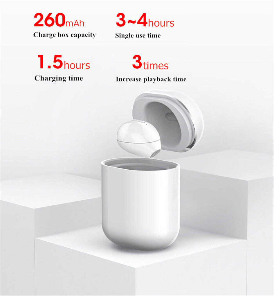 Response Range: 100Hz-20000HzSensitivity: 90+-5dBBluetooth Vrsion: 5.0+EDRSpeaker Driver: 8mmSize: 17*13mmN.W: 3.7gG.W: 52g with packageDecode: SBC, AACEarphone battery: 55mABattery life: 5HoursCharging case battery: 250mA; charge two times for the earphone