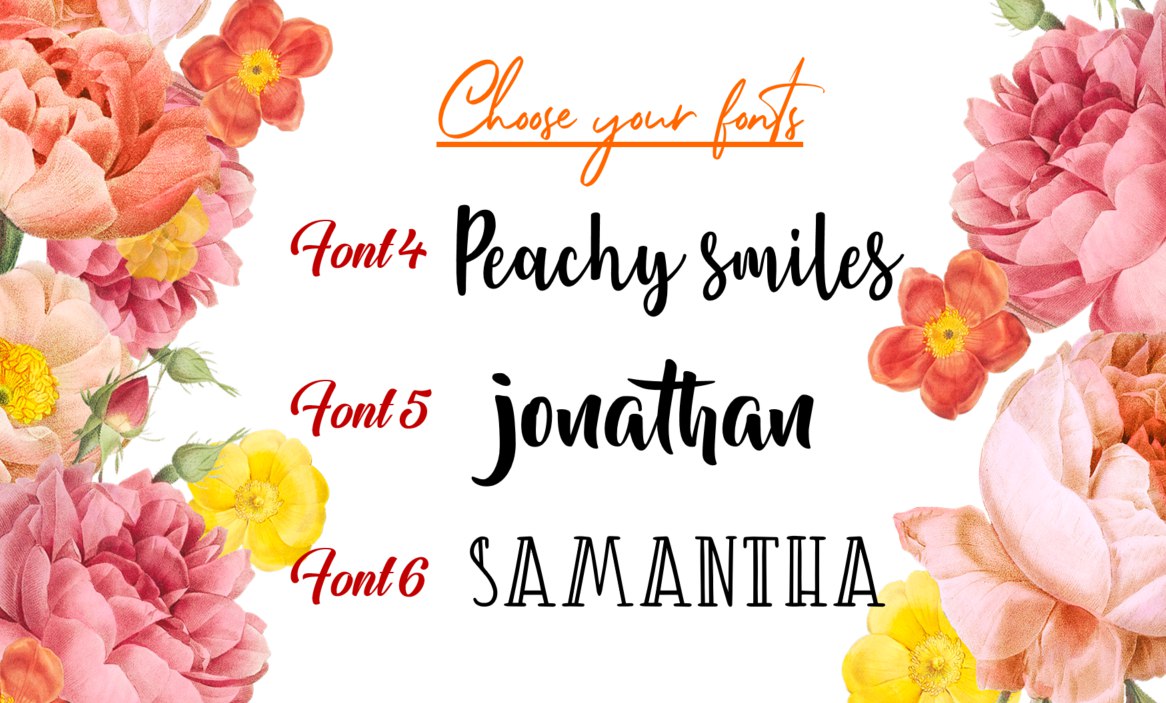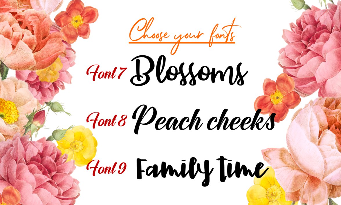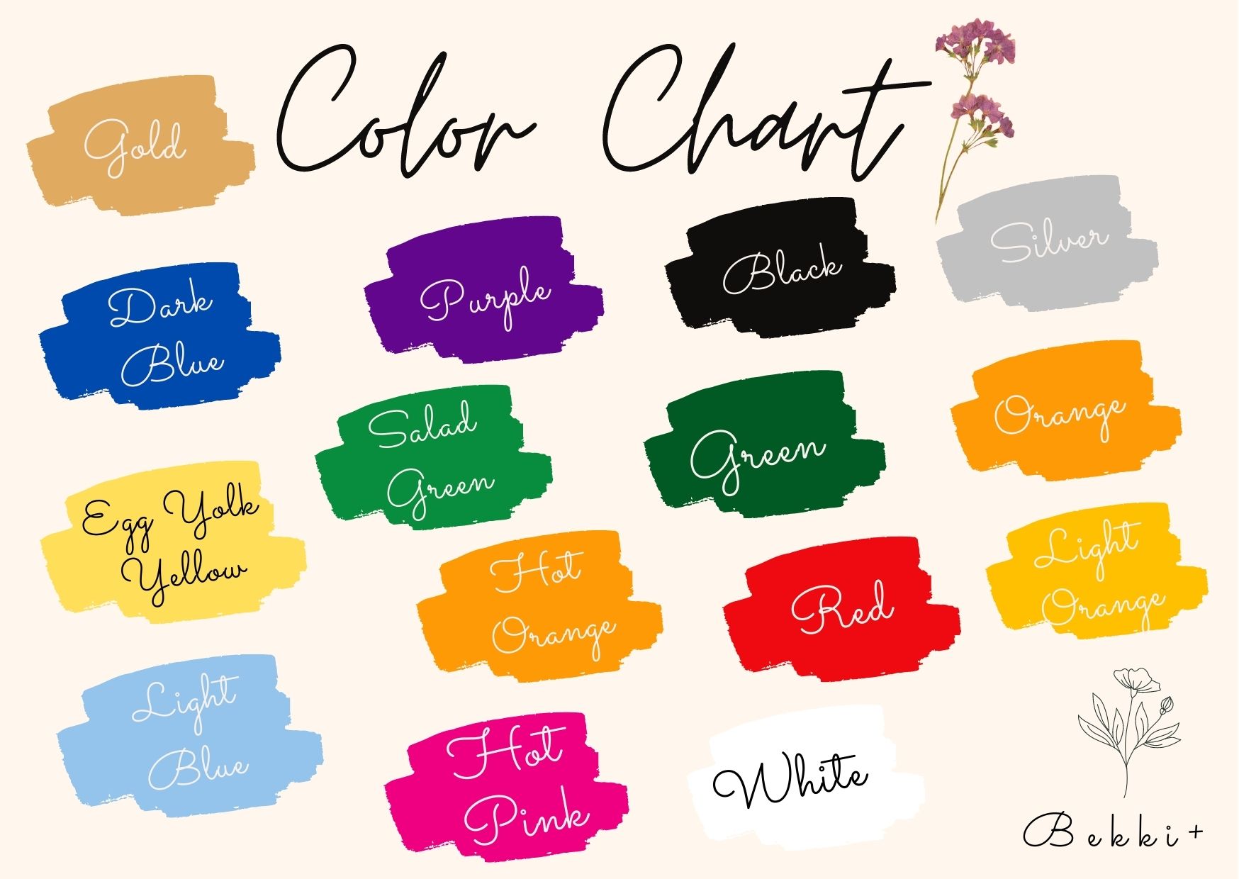 - Font color [1. Gold, 2.Dark blue, 3. Egg Yolk Yellow, 4. Light blue, 5. Purple, 6.Salad Green, 7. Hot Orange, 8. Hot pink, 9. Black, 10. Green, 11. Red, 12. White 13. Silver, 14. Orange, 15. Light Orange]