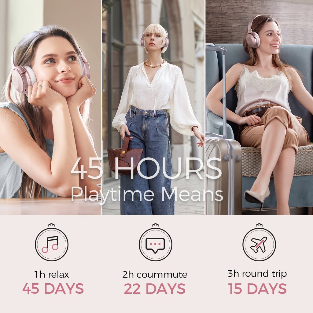 Fast Charging Function for 45H Playtime: 10 minutes of charging give you 2 hours listening time A built-in 650mAh battery won't allow your headphones to power off you can enjoy your world without noise for 45 hours' long time in Full charge. Note: Turn off ANC to avoid power consumption if headphones are not in use.