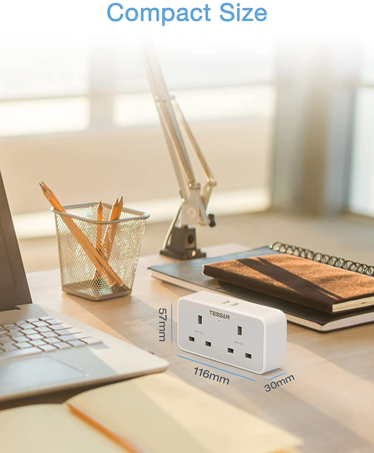 - Space saving - This two plug extension has a compact design (11.3 x 10.2 x 2.6 cm), which create a charging station and will not block another socket in the same row. No more need to plug in a lot of power adapters