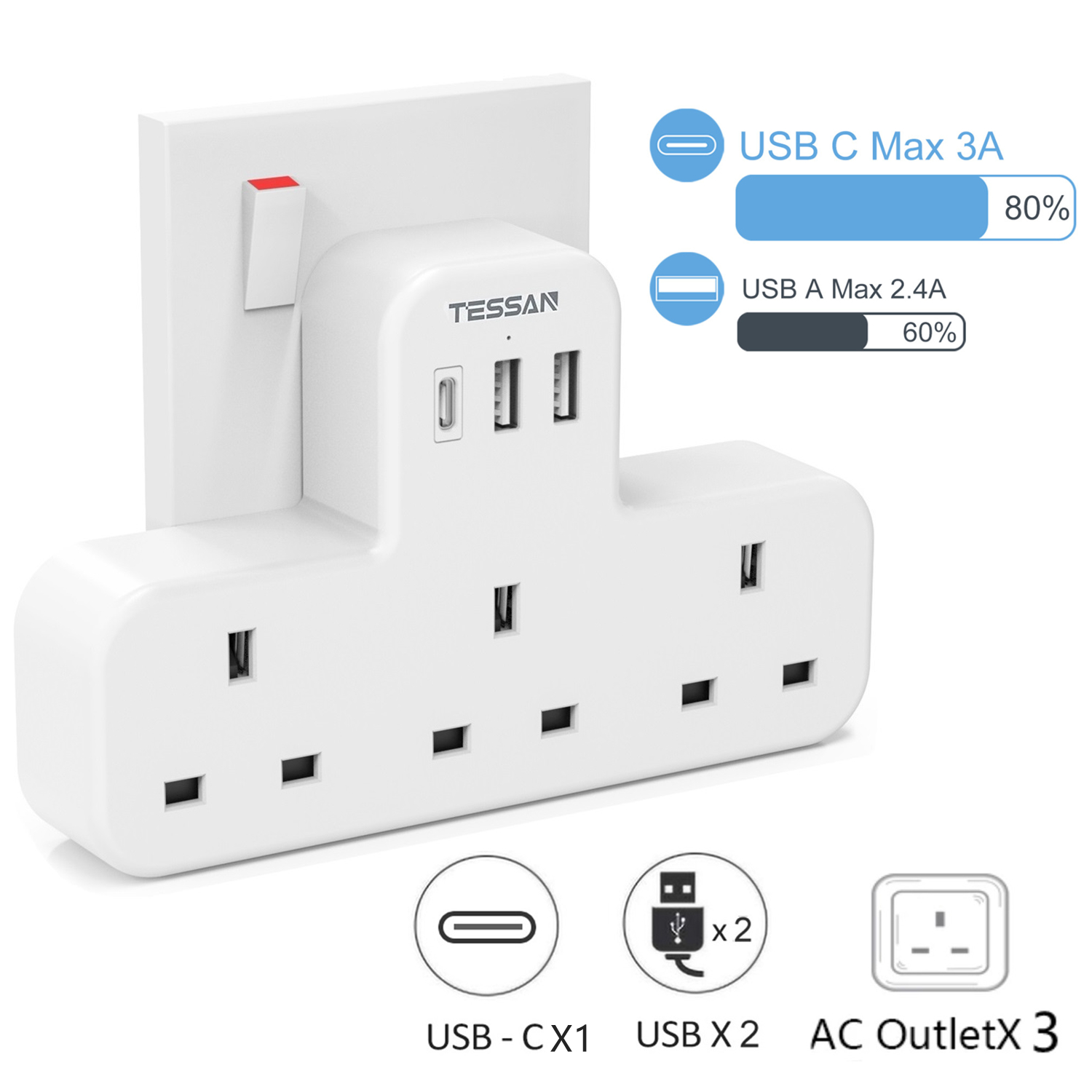 - Multi USB Plug: This USB plug extends a normal UK Power outlet to 2 USB ports while reserving your AC outlet, which can support 3 devices to charge at the same time. Max capacity up to 3250W (250V/13A).