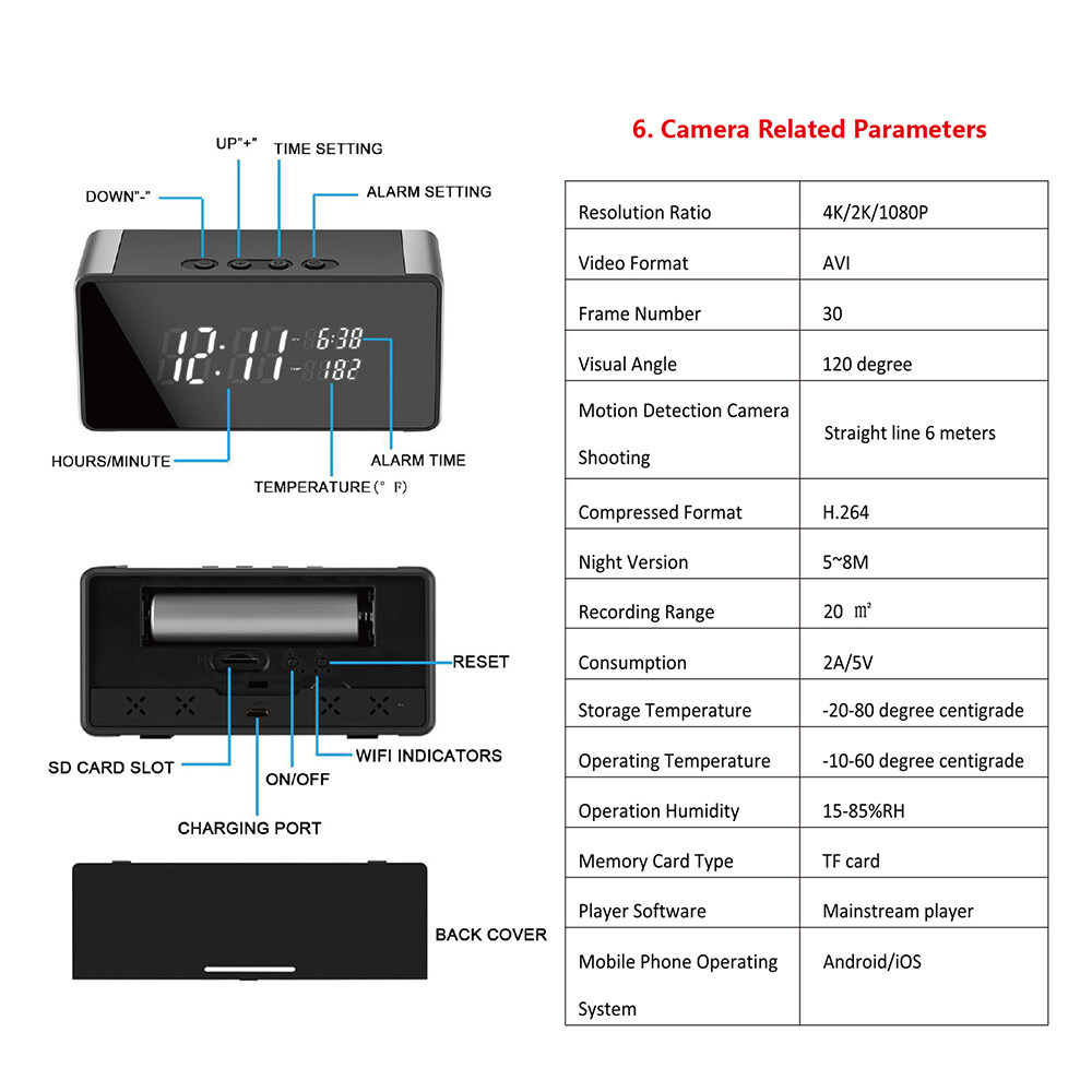 Original Wifi Electronic Clock Camera 4K/1080P Hidden Wireless Micro Camera Infrared Night Vision Digital Clock Remote Monitoring Motion Detection 1600mAh Monitoring Camera Support 128G TF Card