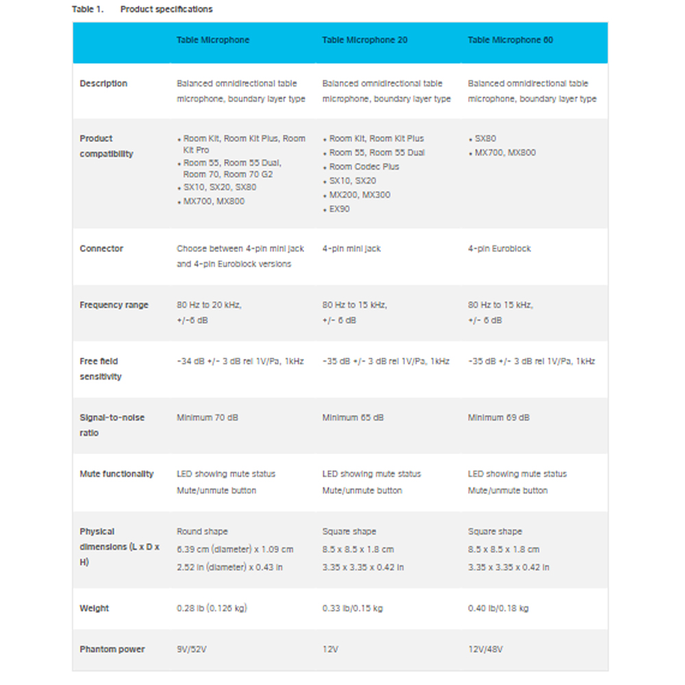 The Table Microphones 20 and 60 provide high-quality omnidirectional coverage ideal for small-to-large meeting rooms with fixed tables. They will continue to be available to enable design consistency for rooms that already have these microphones installed. New customers or new deployments should opt for the latest Table Microphone product.