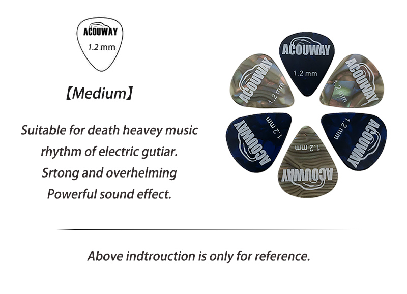 How to use: 0.46MM Suit for Acoustic Guitar chord strum0.71MM Suit for Acoustic Guitar Chord Strum & Solo0.96MM Suit for Electric Guitar Chord Strum1.2MM Suit for Elelctric guitar solo and heavy music