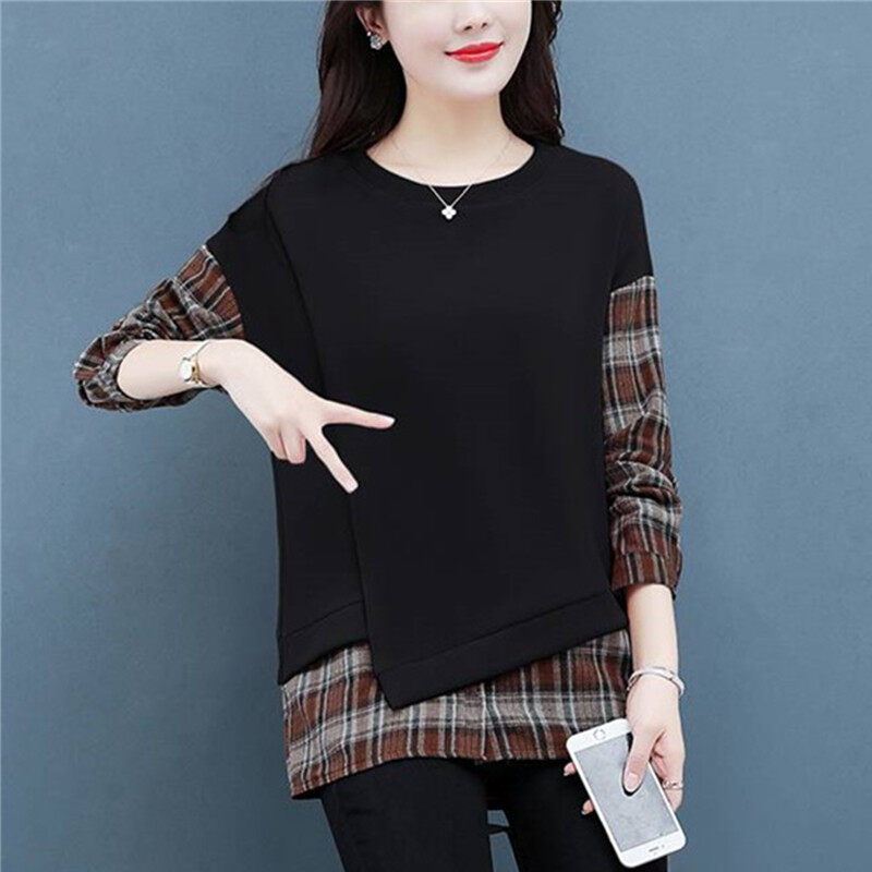 2022 New Fake Two-piece Plaid Bottoming Shirt Women Plus Size Casual Long Sleeve Shirt