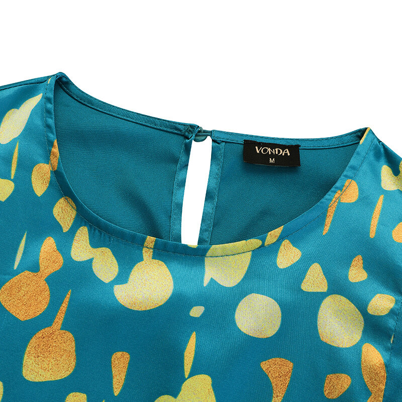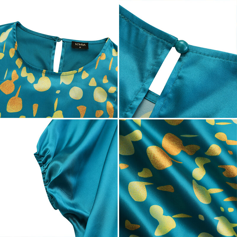 (Korean Causal) VONDA Womens Puff Sleeve Shirt Dress Holiday Casual Sundress Retro Solid Long Tops
