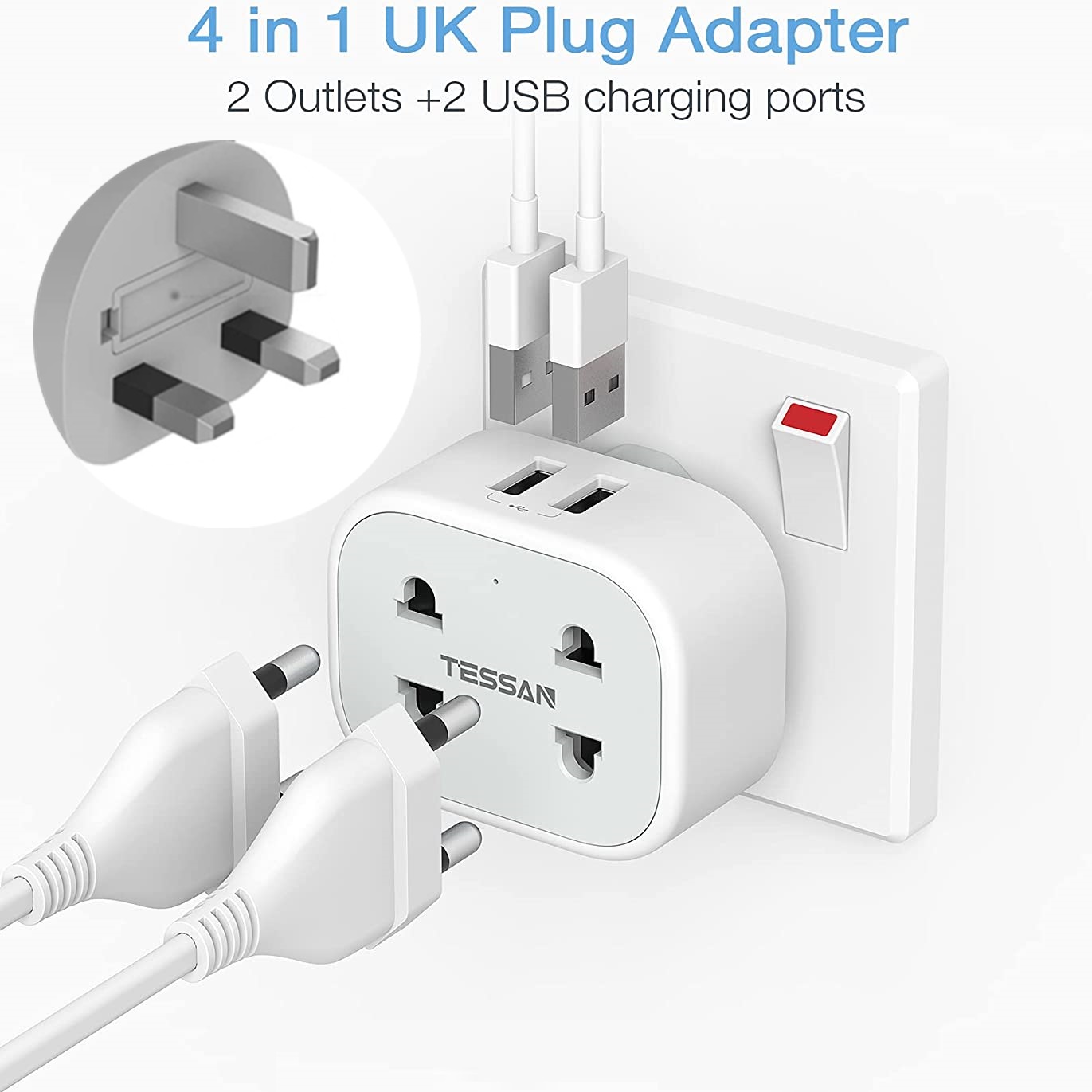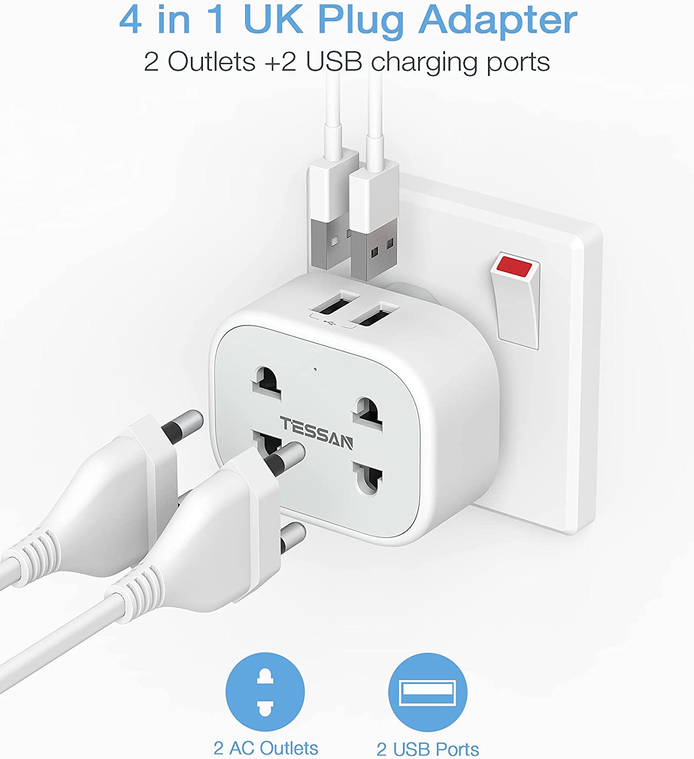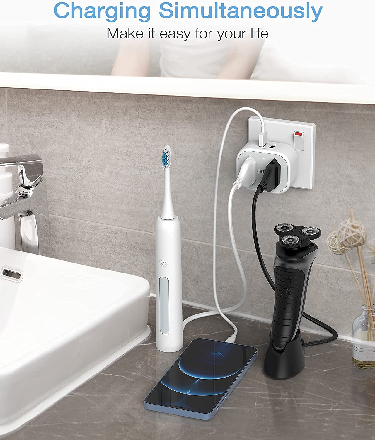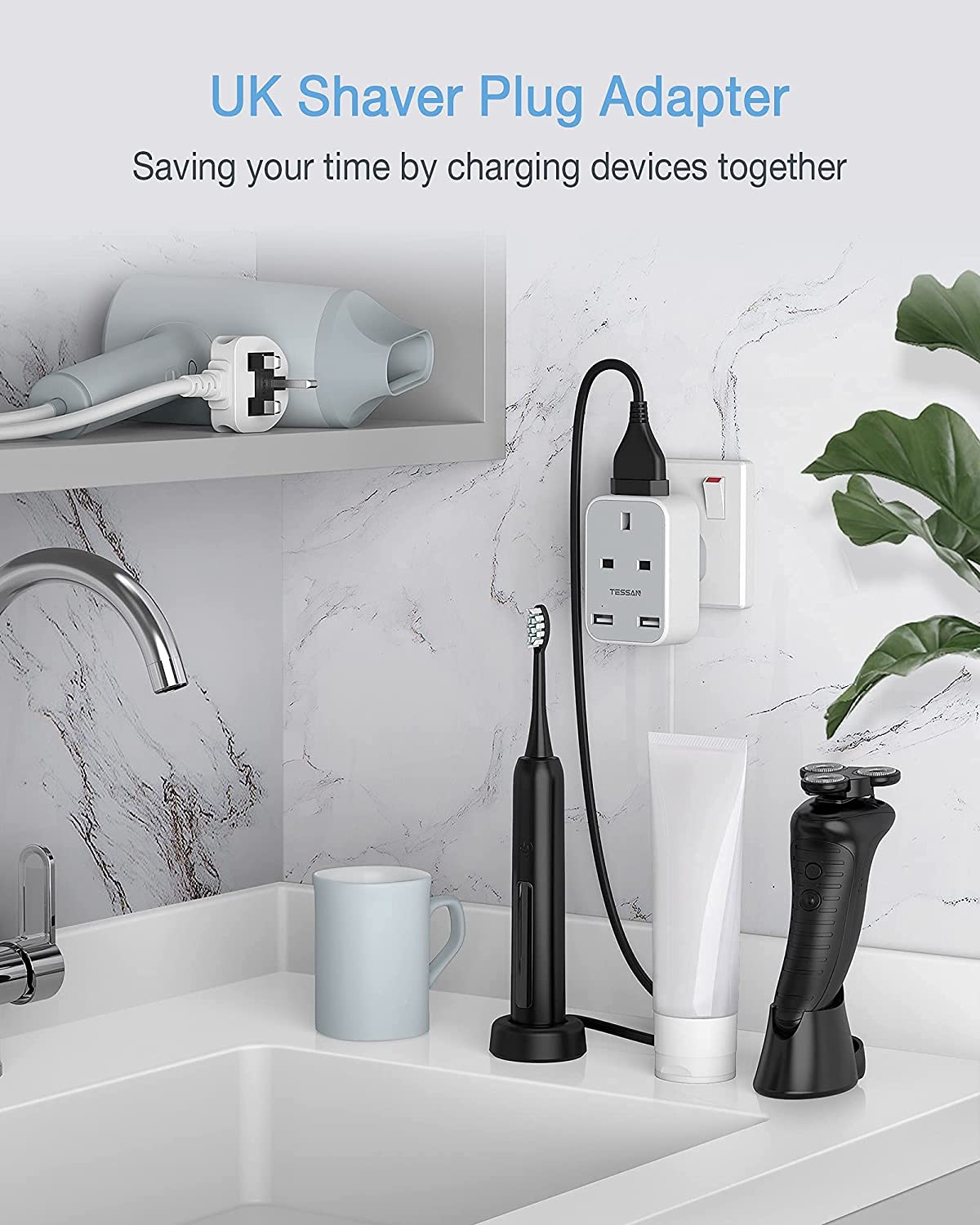 TESSAN 2 Way Shaver Plug UK 2 Pin to 3 Pin10A Fuse Electric Shaver Adaptor with 2 USB Ports and 2 Outets Razor Plugs Bathroom Two to Three Prong Charging Tooth Brush Plugs Adapters Electrical Shaving