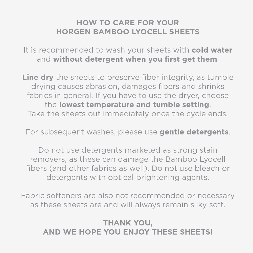 Unlike other versions of bamboo sheets that may be made with bamboo viscose, our bamboo sheets are 100% Bamboo Lyocell. Compared to Bamboo viscose, our Bamboo Lyocell features a superior hand feel, better draping characteristics, and more importantly, greater moisture absorbing properties. This collection of sheets will surprise you with its beautiful lustre, wonderful hand feel and ability to keep you cool throughout the night.