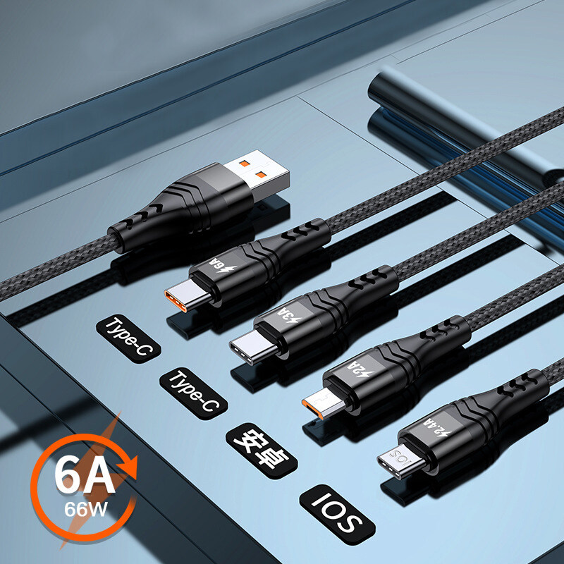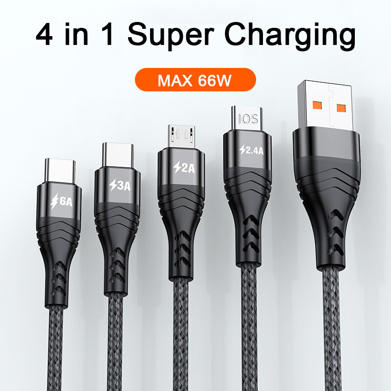 DISOUR Original 2M 6A 66W Super Fast Charging Cable 4 In 1 2*Type-C Micro USB Lightning Charger Cable Nylon Braided For IOS Android For Xiaomi Samsung iPhone All Smart Phones 1.2M 3IN1