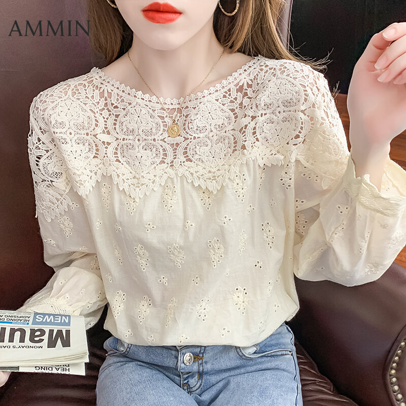 AMMIN Korean style women's long-sleeved hollow lace stitching embroidery lace shirt Fashion loose lace embroidery top Lady cotton linen embroidery Blouse