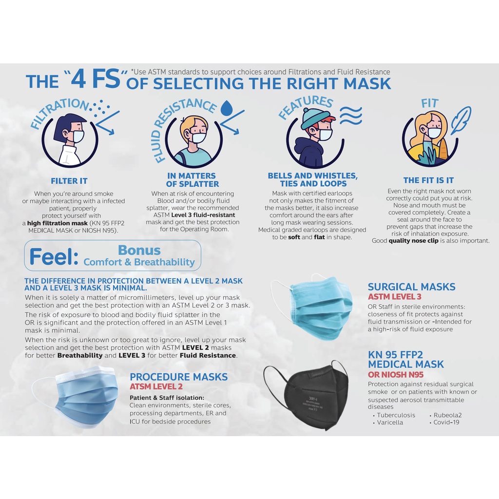 KN95 FFP2 Medical Mask (Non-Sterile BFE & PFE 99) • HSA Notified; ISO13485 Certified; CE Approved • Singapore Exclusive Distributor, Authenticity and Quality Guaranteed • 5-Layer protection • Without Glass Fibres • Hypoallergenic • High Filtration Capacity • ≥ 99 % BFE Certified • ≥ 99 % PFE Certified • Fluid Resistant • PM 2.5 Certified • FFP2 Certified Protection against residual surgical smoke or on patients with known or suspected aerosol transmittable diseases such as COVID-19. For Single Use Only.