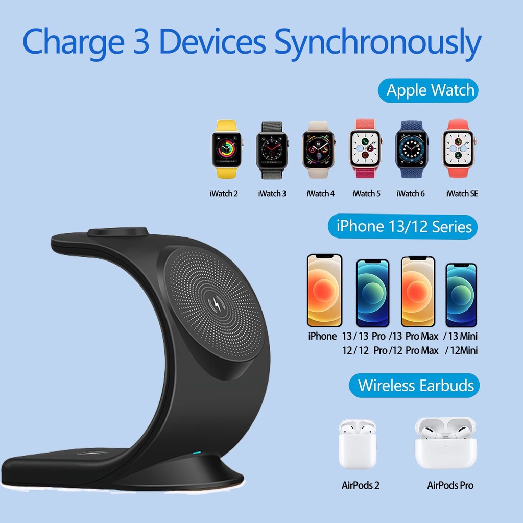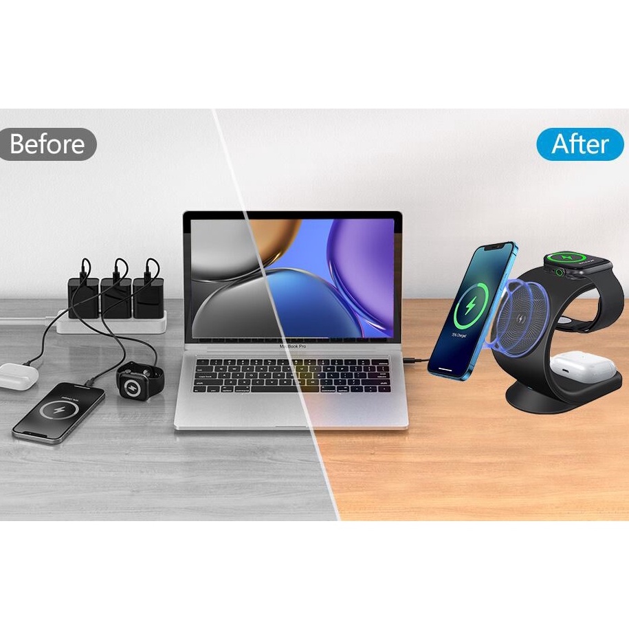 【3 in 1 Magnetic Wireless Charging Station】A charging station for multiple devices Apple iPhone 13, iPhone 13 Pro, iPhone 13 Pro Max, iPhone 13 Mini and iPhone 12, iPhone 12 Pro, iPhone 12 Pro Max, iPhone 12 Mini, iPhone 11/10/9/8 but need to have MagSafe case and for Apple Watch Series iWatch SE /6/ 5/4/3/2 and for AirPods Pro and AirPods 2nd generation. (Not compatible with AirPods 1st) 【Charge in Any Orientations】With the Magnetic wireless charger stand you can do the FaceTime in portrait or easily switch your phone to landscape to watch movies. The Desktron Magnetic Charger makes wireless charging a snap, which gives you the best charging experience for your multiple Apple devices. 【Fast Wireless Charging, Max 15W】Made for MagSafe this wireless charger provides up to 15-Watts for iPhone 13 and 12 series. You could charge your smartphone, iWatch and Airpods at the same time. Please use the QC 3.0 fast charging. 【With Auto-Alignment MagSafe Charging Technology】DESKTRON Wireless Charger Station with MagSafe Charging, super easy to charge your devices. A dedicated AirPods Pro or AirPods charging spot ensures charging begins on contact, every time. 【Compatible with Cases】 No Need to take off your phone case or AirPods case. This wireless charger dock is compatible with official MagSafe cases. And it can also charge your AirPods through the case. Attn: The phone case should be magnetic and the thickness of the AirPods case should be less than 6mm. (*Metallic/High-Density Case may cause wireless charging difficulties) Product Specification: Material: ABS+PC Input voltage: 5V/2A 9V/2A 12V/1.5A Phone output: 5W/7.5W/10W/15W Earphone output: 3W (max) Watch output: 2W (max) Input Wall Adaptor port: Type C Transmission distance: ≤6MM Charging efficiency: ≥73% Colour: Black/White Product size: about 127*117*71mm/5*4.61*2.80in Net weight: about 180g Product Specification: (20W CHOETECH CHARGER) Input: AC 100-240V, 50/60Hz, 0.5A(Max) Output: DC 5V=3A, 9V=2.22A, 12V=1.67A Total Output: 20W(Max) Size: 1.6×1×1.7inch What's in the package? - 1x 3-1 Wireless Charging Dock - 1x TYPE-C USB Cable (If Purchase QC Charger together the cable will swap to Type-c To Type C cable) 3 Months Local Warranty *Terms and conditions applied *