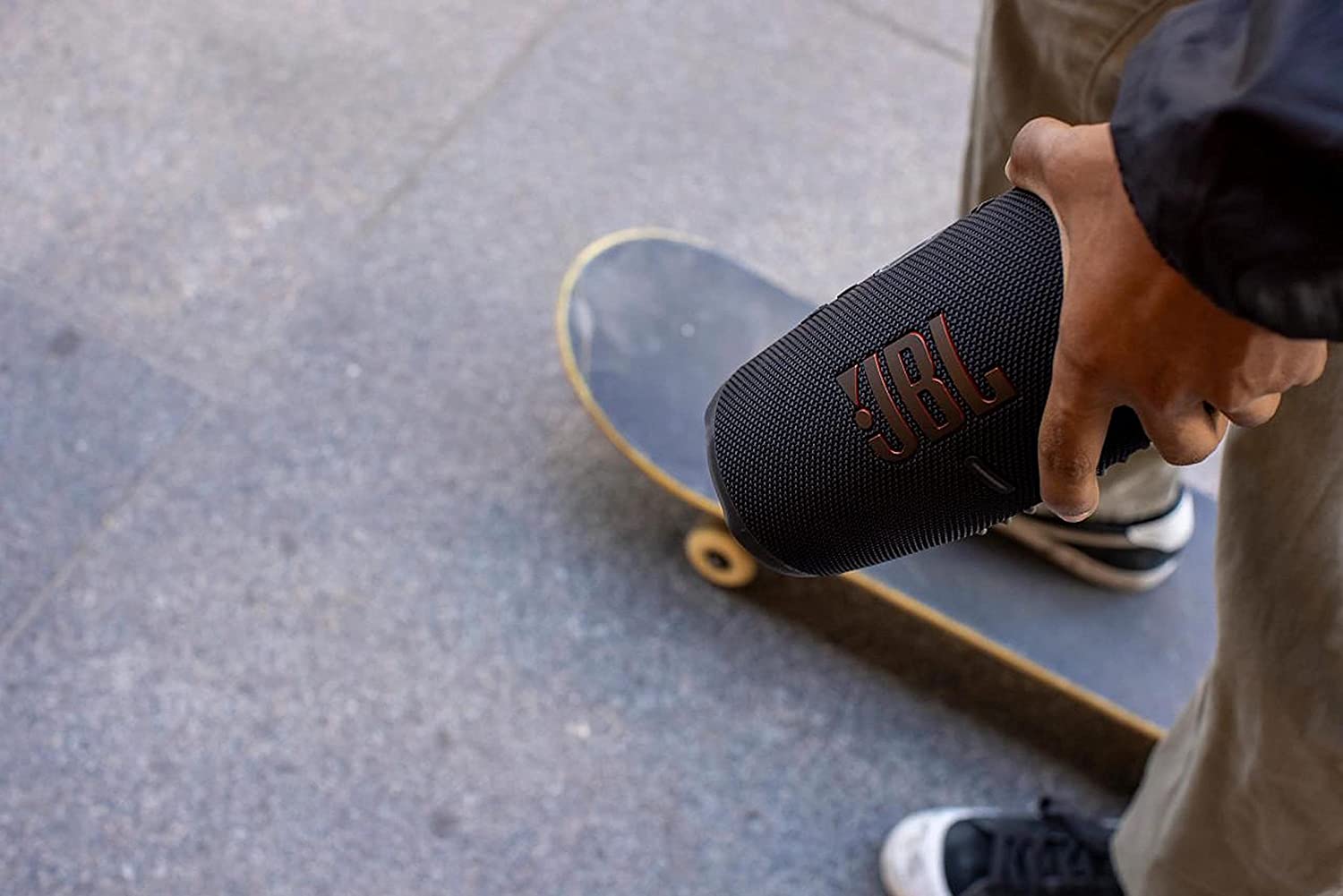 The JBL Charge 5 portable Bluetooth speaker delivers bold JBL Original Pro Sound, with its optimized racetrack-shaped driver, separate tweeter and dual pumping JBL bass radiators. Up to 20 hours of playtime and a handy built-in powerbank to keep your devices charged to keep the party going all night. Rain? Spilled drinks? Beach sand? The IP67 waterproof and dustproof Charge 5 survives whatever comes its way. Thanks to PartyBoost, you can connect multiple JBL PartyBoost-enabled speakers for a sound big enough for any crowd. With all-new colors inspired by the latest street fashion trends, it looks as great as it sounds.
