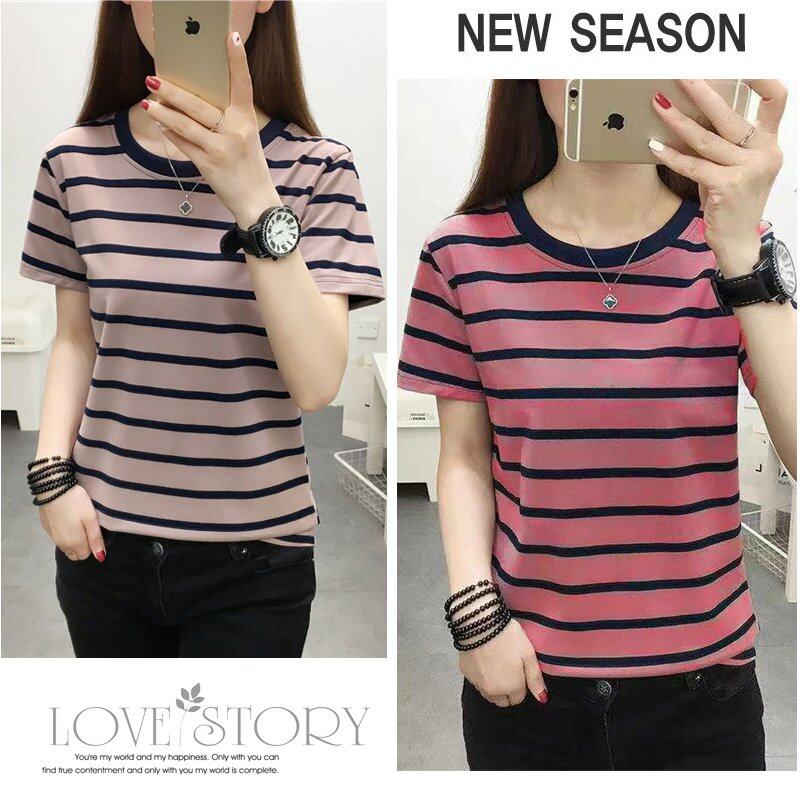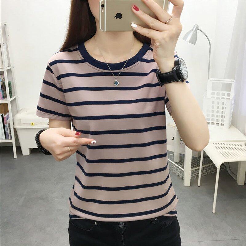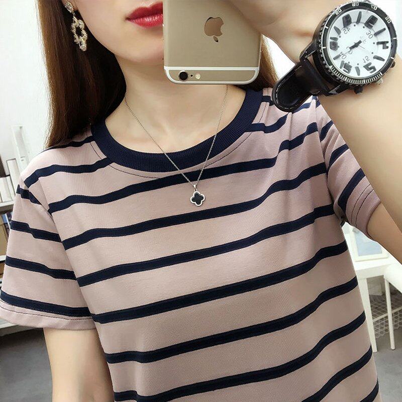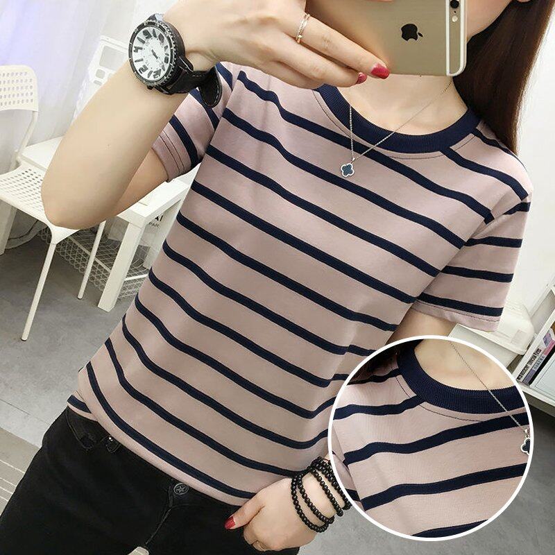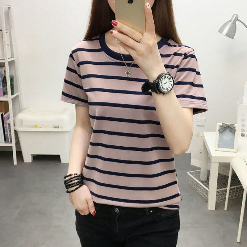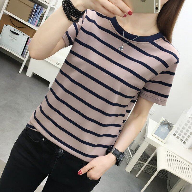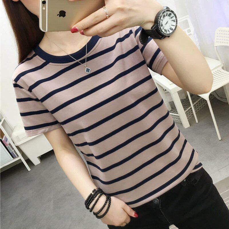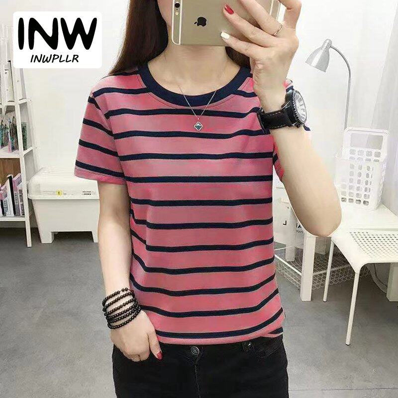 INWPLLR Women's Tshirt Fashion Short Sleeve O-neck Top Tee Casual Korean Style Stripe Tops For Women