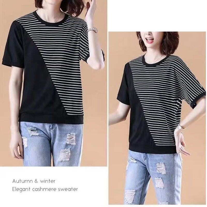 INWPLLR Large Size Women Tops Patchwork T-shirts Casual Loose Short Sleeve Top Korean Stripes Tshirts