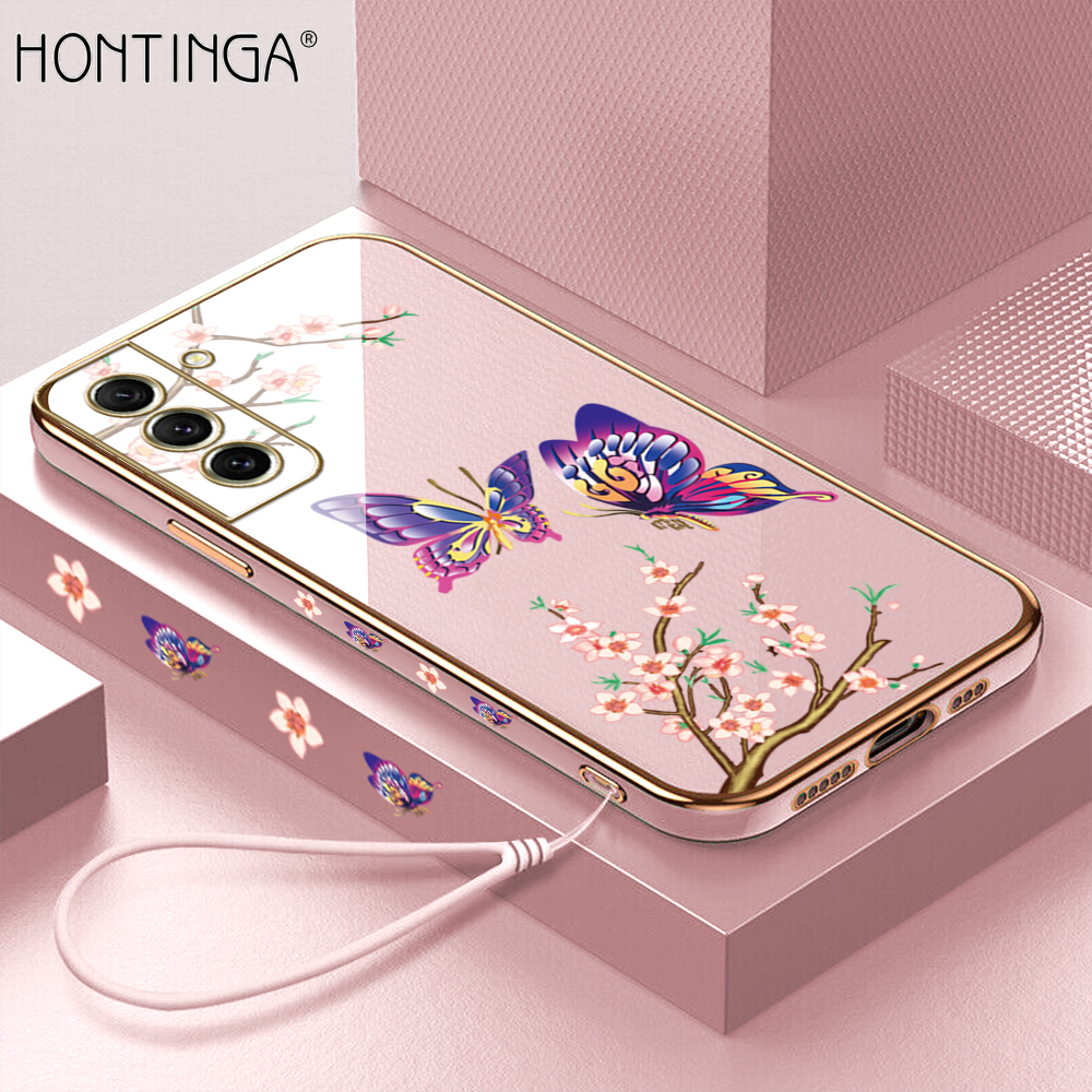 Hontinga Casing Case For Samsung Galaxy S21 FE S21FE 5G Case Fashion Colorful Butterfly Luxury Chrome Plated Soft TPU Square Phone Case Full Cover Camera Protection Anti Gores Rubber Cases For Girls