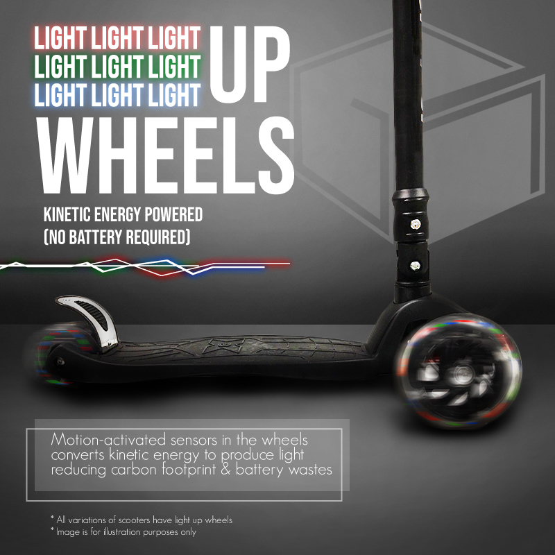[Smart LED wheels] Using induction energy when riding on the scooter to create those charming bright lights, hence, no batteries required.