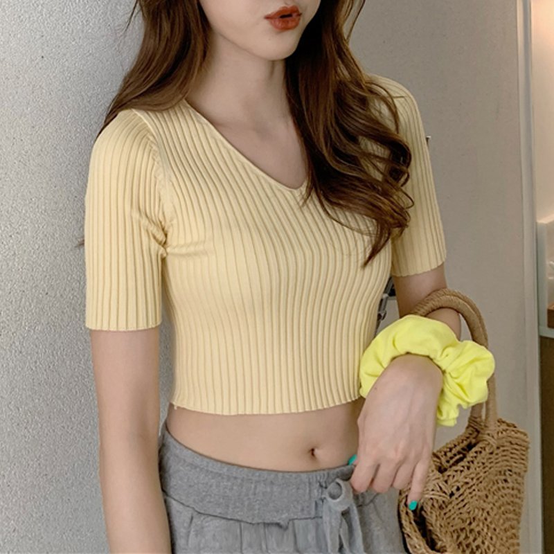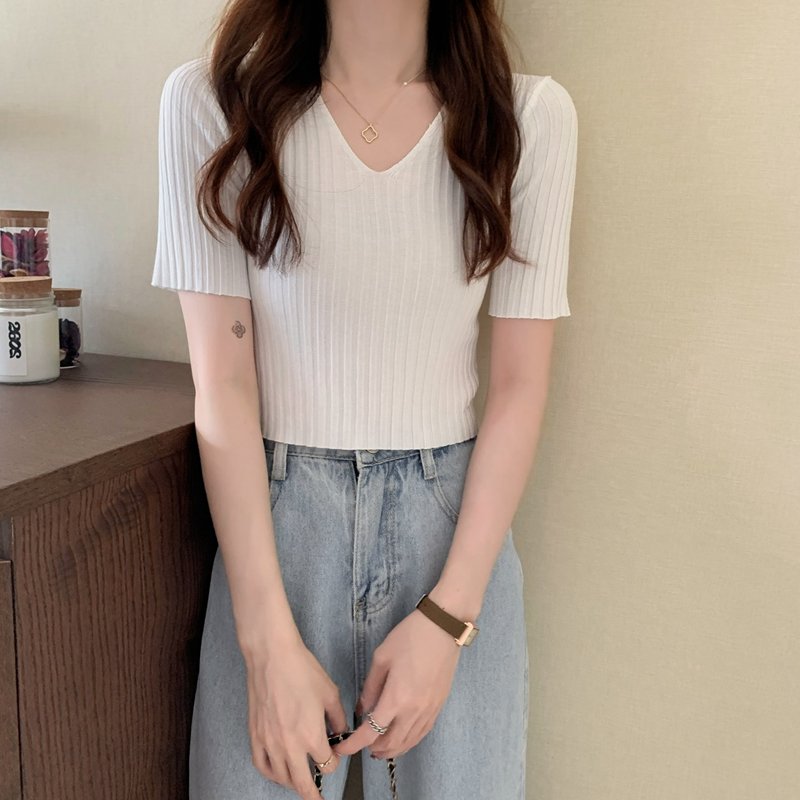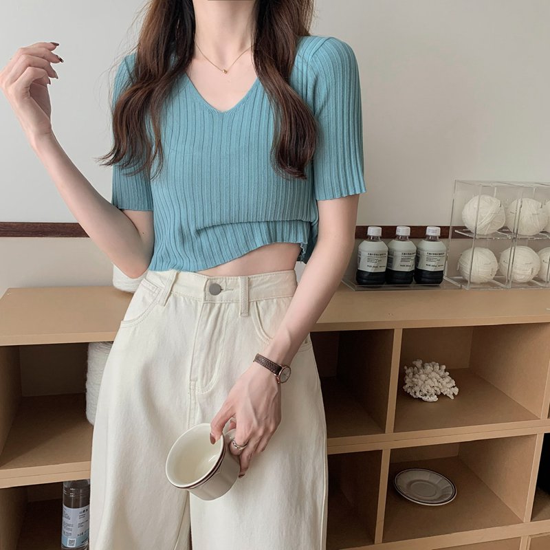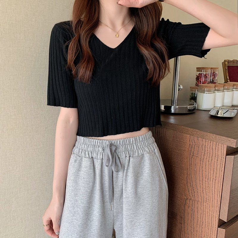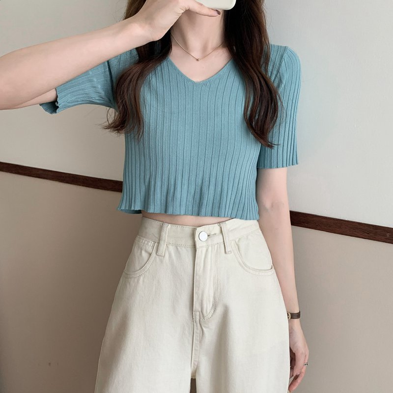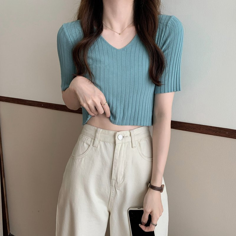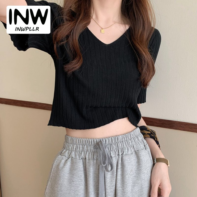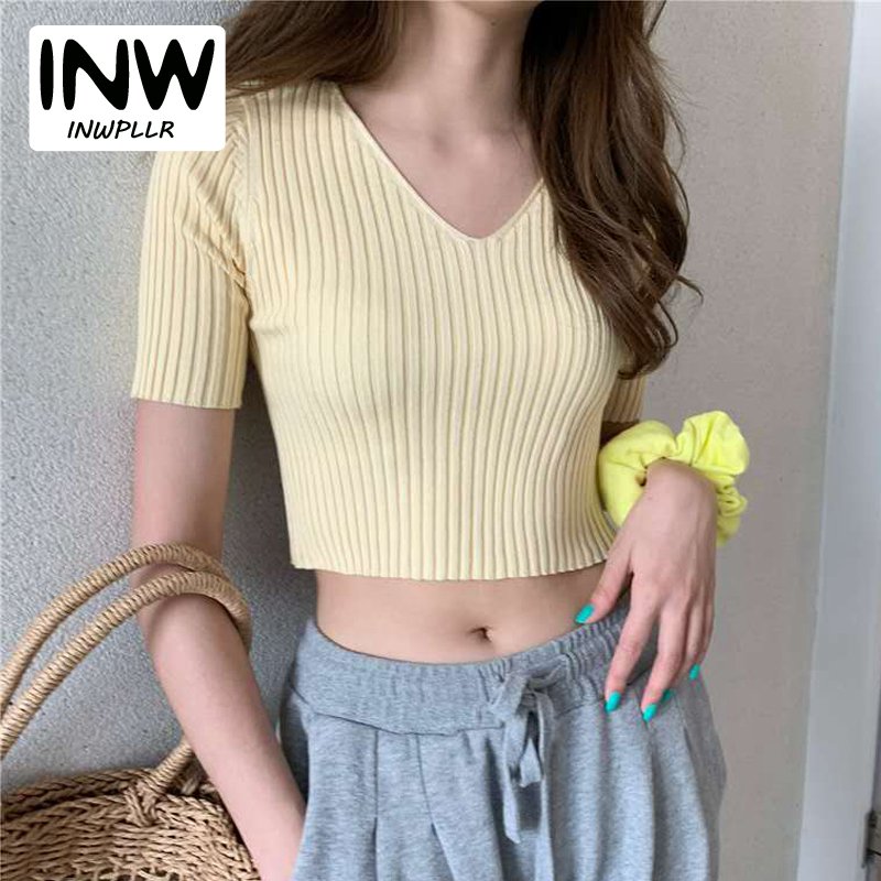 INWPLLR Women's Ins Tide T-shirt Summer V-neck Short Sleeve Section Exposed Navel Tops Casual T shirts Female