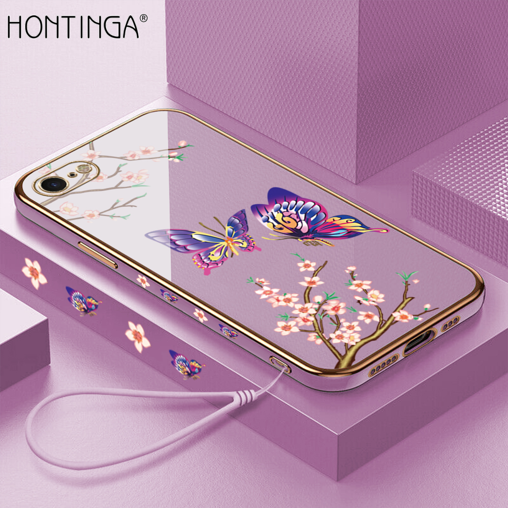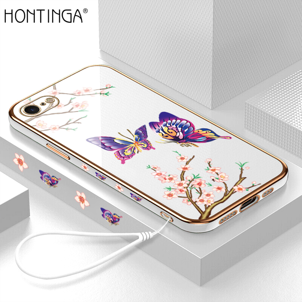 Hontinga Casing Case For New iphone SE 2022 SE3 SE 3 Case Fashion Colorful Butterfly Luxury Chrome Plated Soft TPU Square Phone Case Full Cover Camera Protection Anti Gores Rubber Cases For Girls