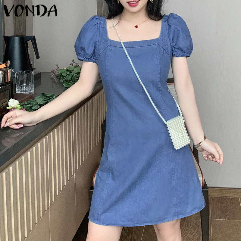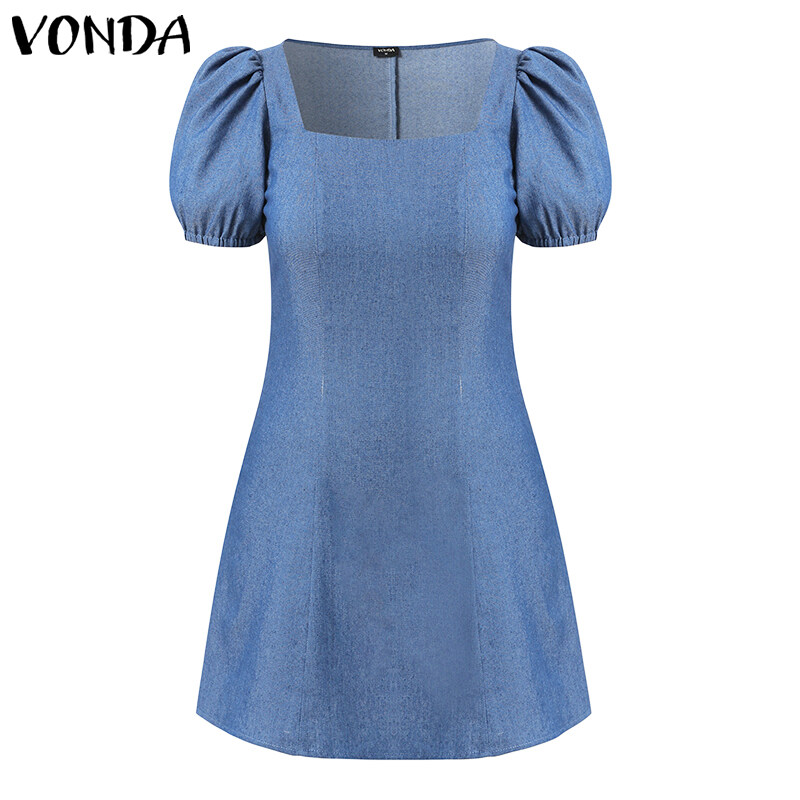 (Korean Causal) VONDA Womens Puff Sleeve Shirt Dress Holiday Casual Sundress Retro Solid Long Tops