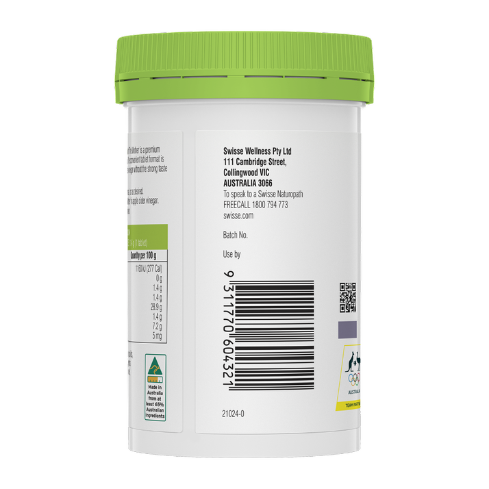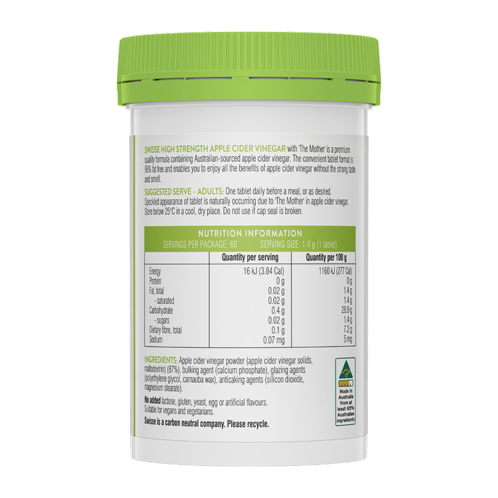 ---------------BENEFITS---------------Made with 100% Australian applesContains 'The Mother'---------------------INGREDIENTS---------------------EACH TABLET CONTAINS: APPLE CIDER VINEGAR powder (apple cider vinegar solids, maltodextrin) (87%)Bulking agent (calcium phosphate)Glazing agents (polyethylene glycol, carnauba wax)Anticaking agents (silicon dioxide, magnesium stearate)ALLERGEN INFORMATION-------------------DIRECTIONS-------------------ADULT DOSAGE:One tablet daily before a meal, or as desired.---------------STORAGE---------------Store below 25°C in a cool, dry place.-----------------WARNINGS-----------------Speckled appearance of tablet is naturally occurring due to 'The Mother' in apple cider vinegar.