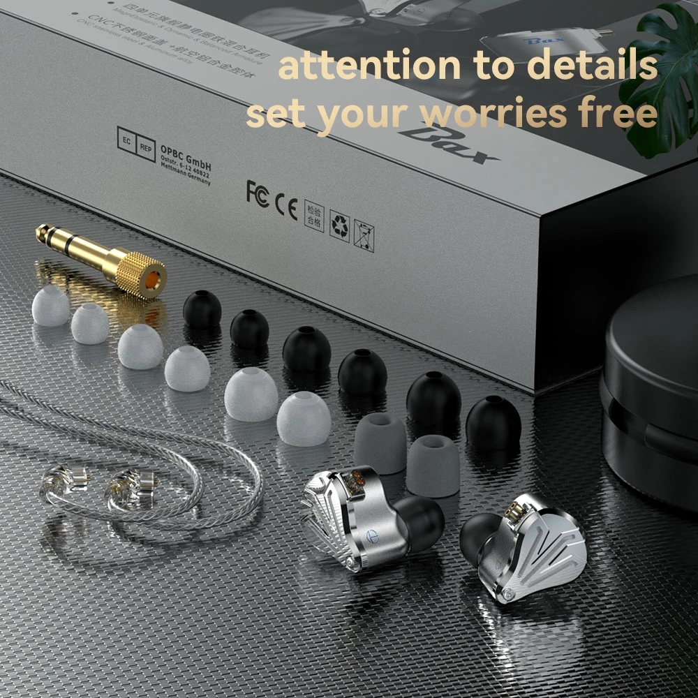 16 strands of silver-plated wires, Aluminum storage case, Balanced ear tips 3 pairs (SML) + Bass ear tips 3 pairs (SML) + Memory foam ear tips 1 pair, 6.5mm adapter. TRN BAX is fully accessorized for your convenience.