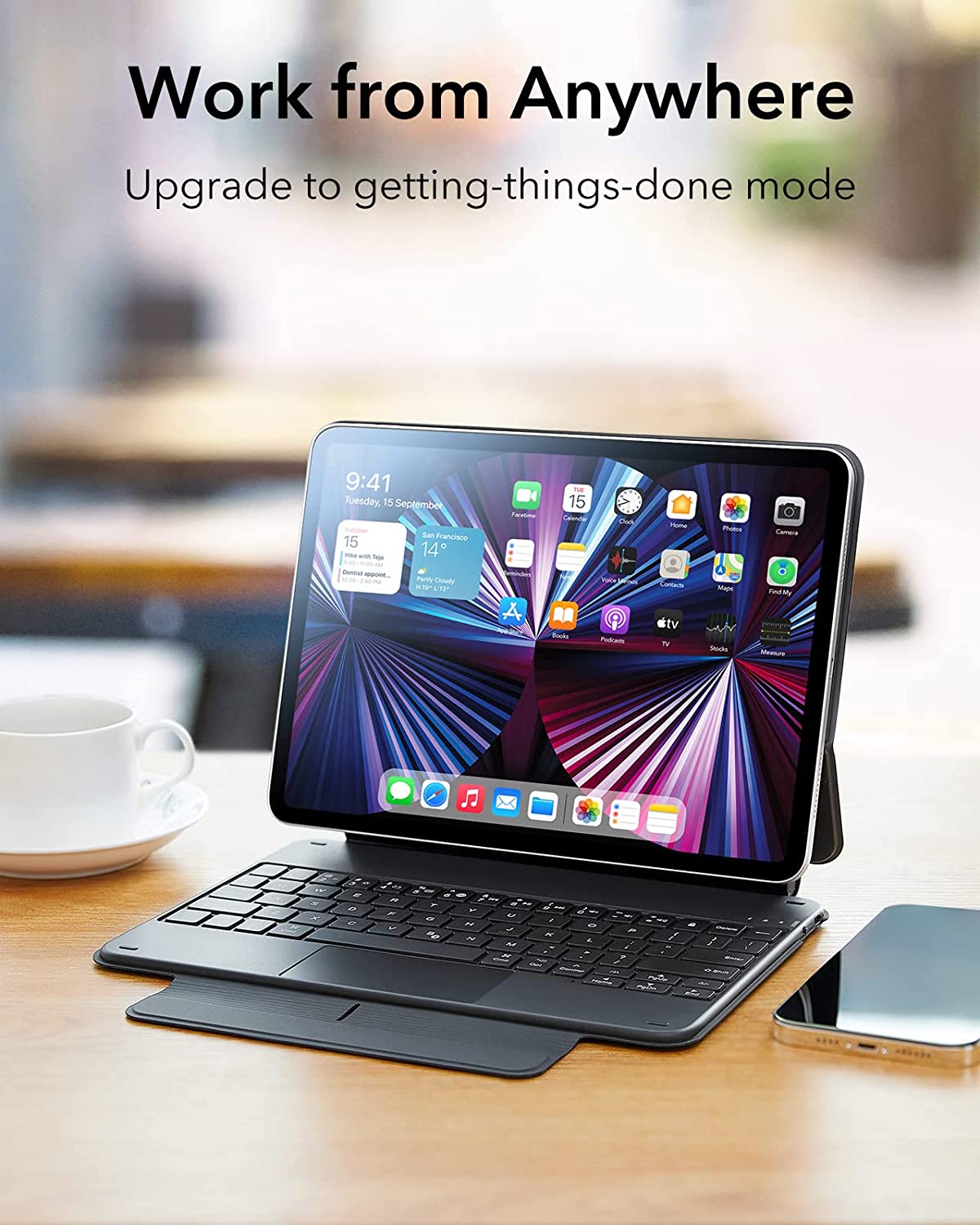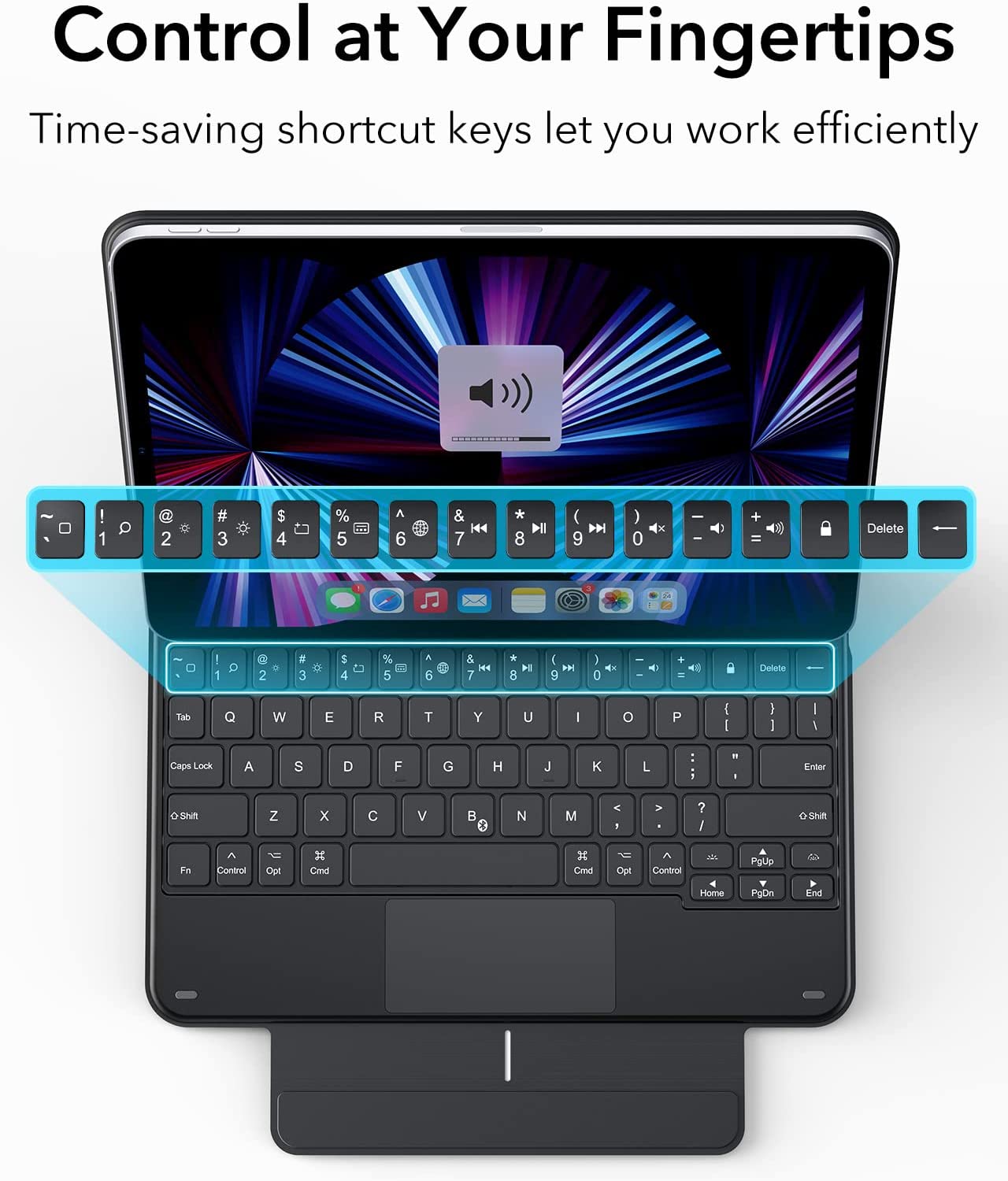 The full row of iPadOS shortcut keys let you switch tasks, adjust your screen, or change your music without leaving the keyboard.