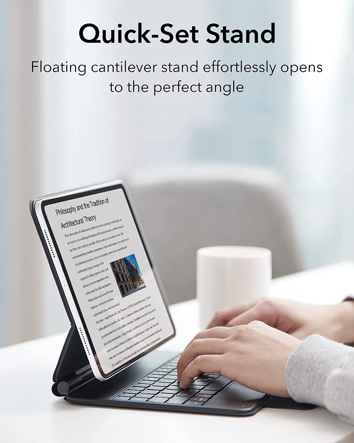 Set the floating cantilever stand with one smooth motion and transform your iPad into a lightweight portable workstation. Be ready to work wherever, whenever.