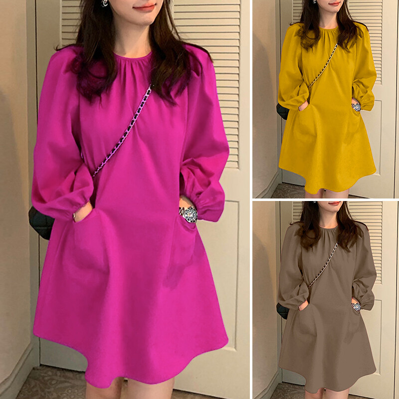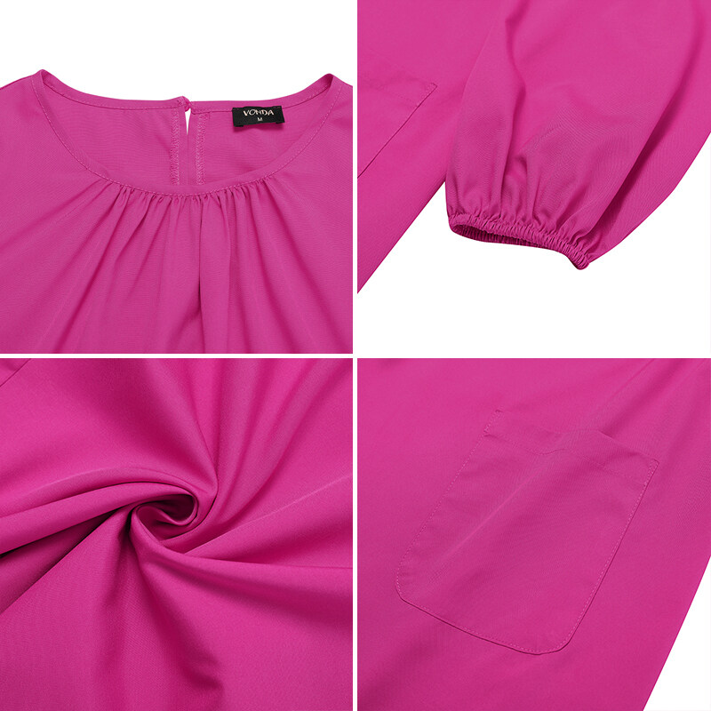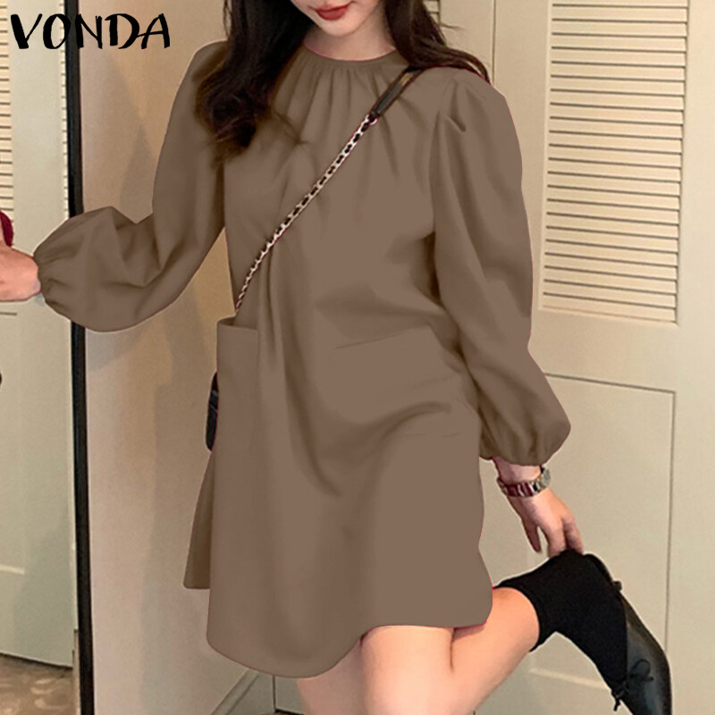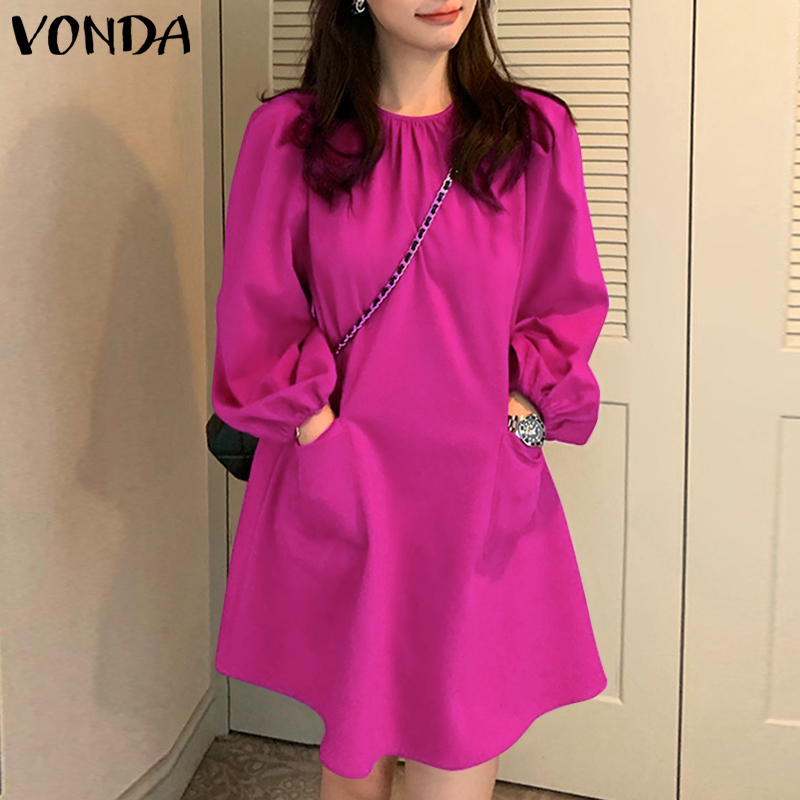 VONDA Womens O Neck Shirt Dress Long Sleeve Elegant Retro Sundress Holiday Dress (Korean Causal)