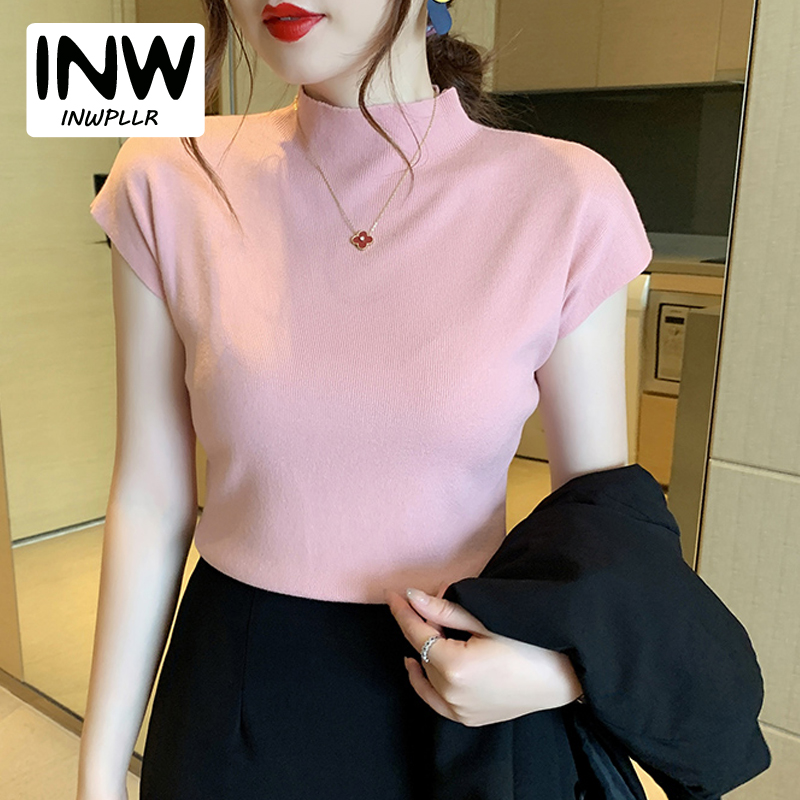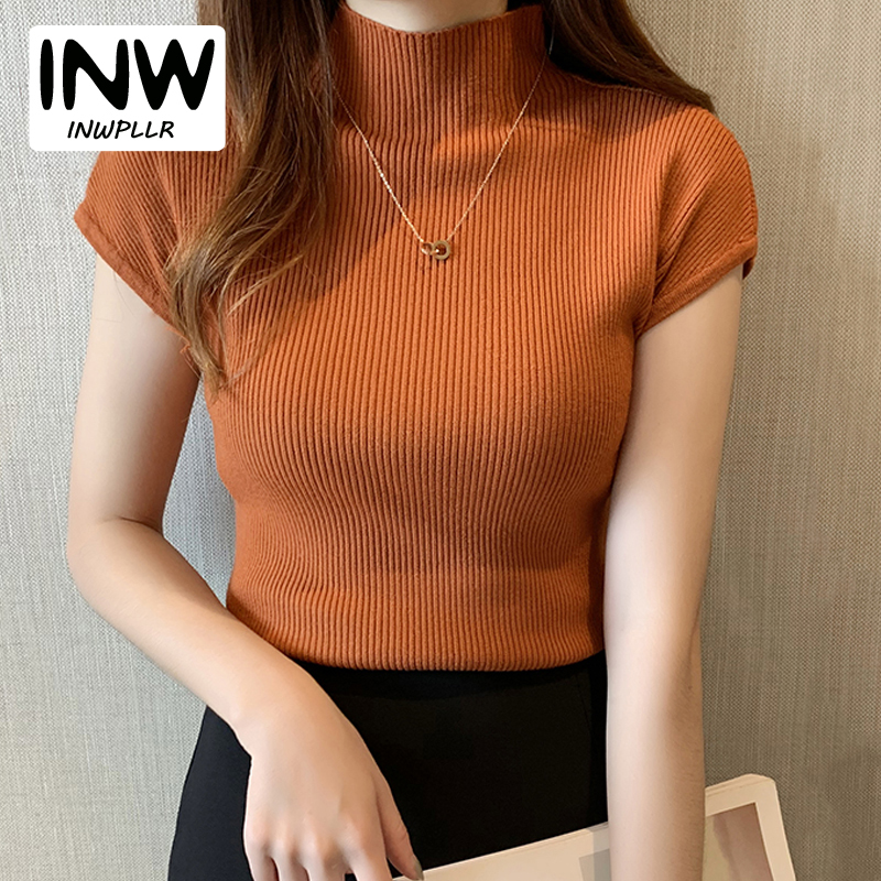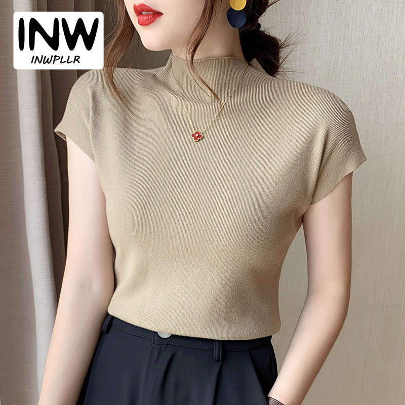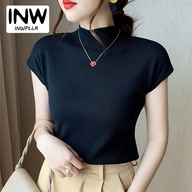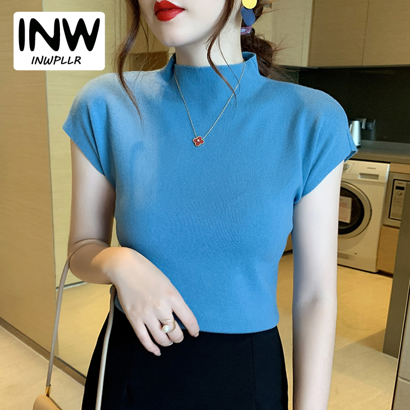 INWPLLR New Casual Women T-shirt Half Turtleneck Short Sleeve Plain Top Summer Slim Bottoming Knitted Tshirts Ladies